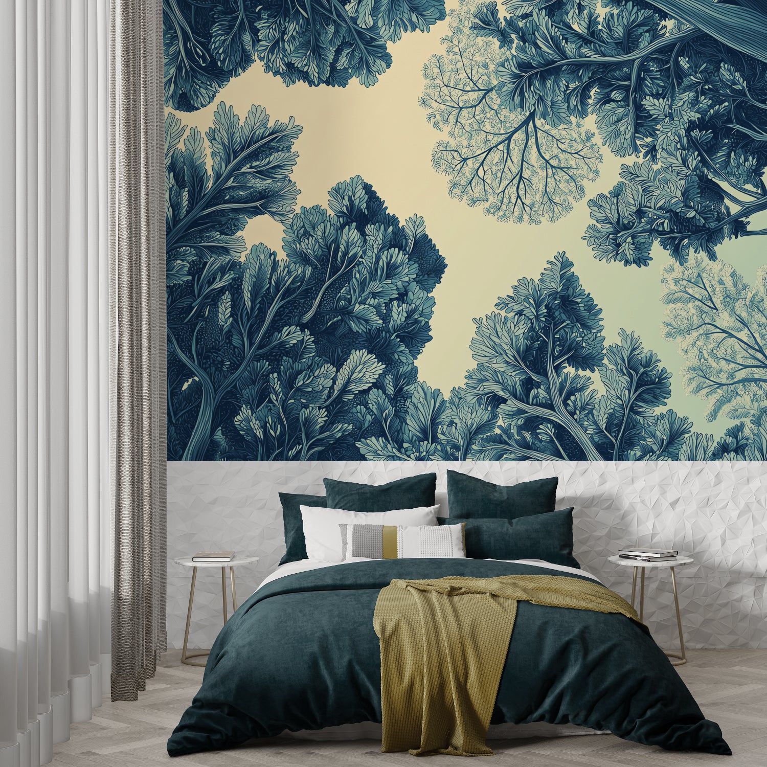 Papel Pintado Mural de Follaje | Arte Botánico Azul sobre Beige