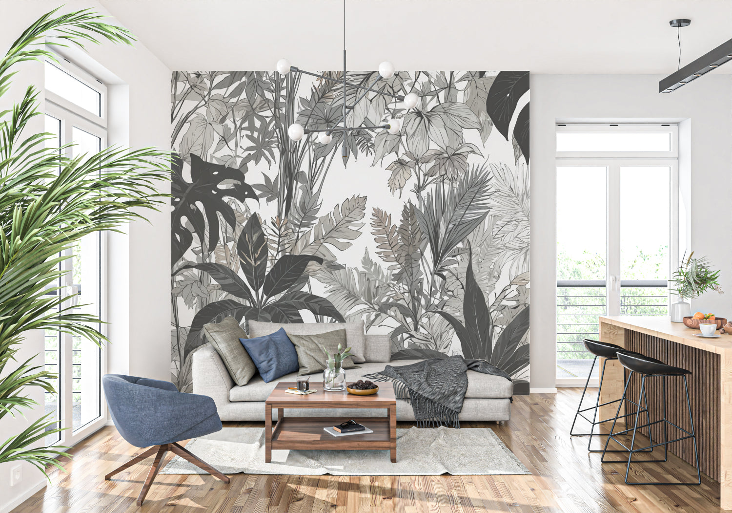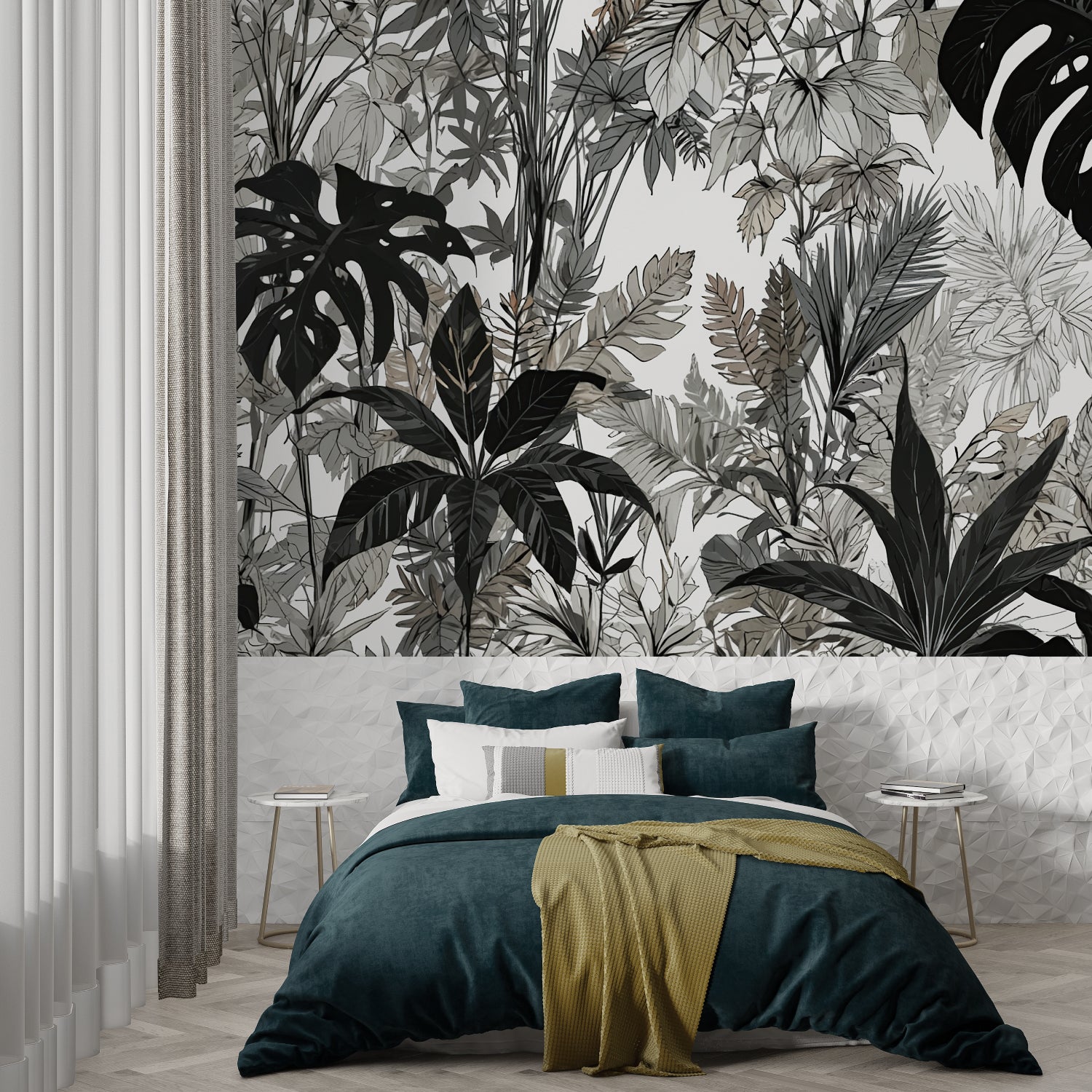 Transforma tu espacio con este papel pintado botánico moderno que une la naturaleza con la expresión artística. El mural tropical monocromo se adapta perfectamente a varios estilos de interior, desde el minimalismo moderno hasta el contemporáneo sofisticado, creando una atmósfera de tranquilidad refinada mientras añade profundidad arquitectónica a tus paredes.