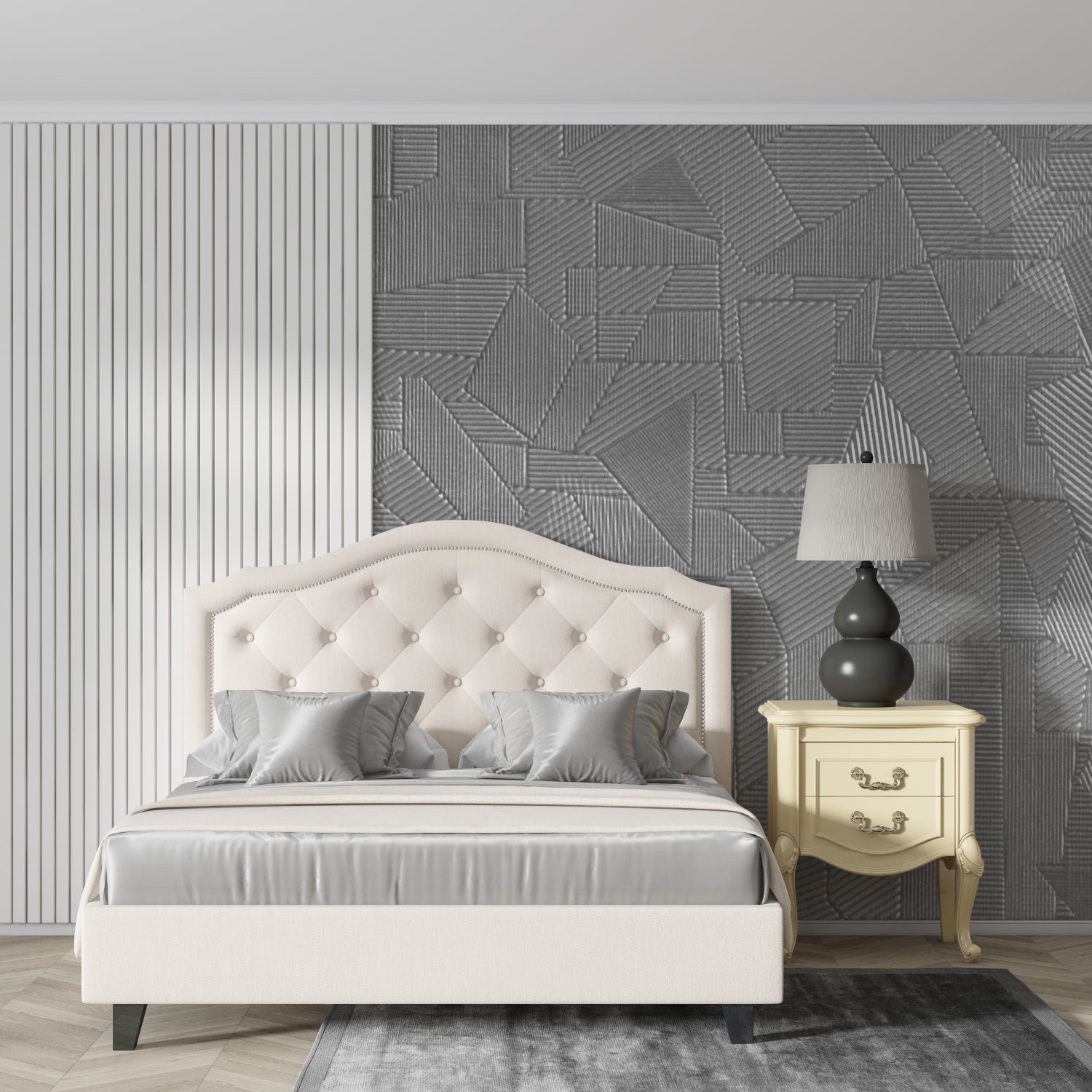 The grey geometric pattern works as a subtle yet striking backdrop.