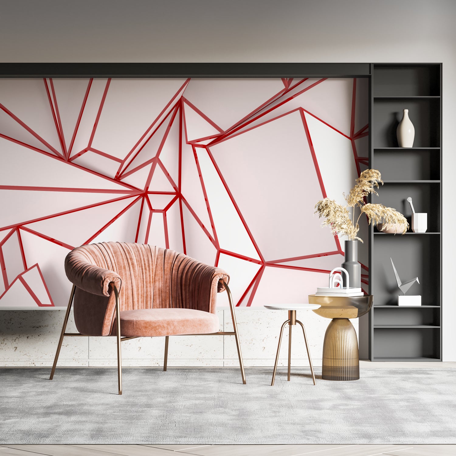 Este diseño de papel pintado geométrico presenta una composición impactante de líneas angulares rojas audaces sobre un fondo blanco inmaculado. La red dinámica de formas geométricas que se intersectan crea un poderoso impacto visual, con patrones de líneas limpias que irradian a lo largo de la pared en una disposición precisamente calculada. El papel pintado geométrico moderno presenta ángulos agudos y bordes nítidos que forman una exhibición arquitectónica intrincada, aportando sofisticación contemporánea a cualquier espacio.