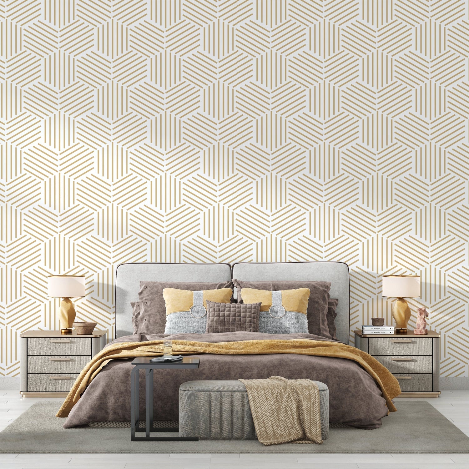 Este papel pintado geométrico presenta un sofisticado patrón tridimensional de líneas doradas entrelazadas sobre un fondo blanco inmaculado. El hipnotizante diseño inspirado en el art déco crea una ilusión óptica de formas cúbicas que parecen extenderse más allá de la superficie de la pared. Cada línea dibujada con precisión contribuye a un ritmo armonioso de formas repetidas, ofreciendo tanto profundidad visual como elegancia arquitectónica.