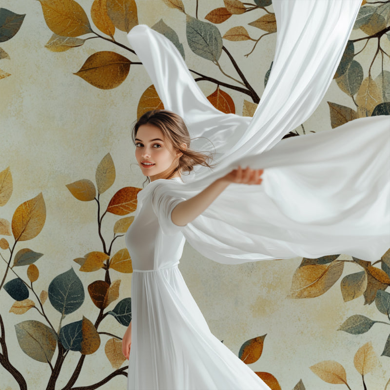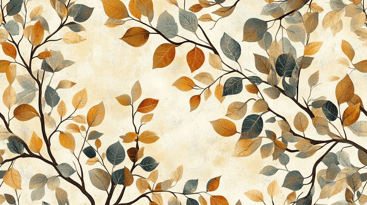 Este mural de pared de naturaleza captura la danza elegante del follaje otoñal contra un fondo beige cálido. Delicadas ramas adornadas con hojas verde salvia y marrón dorado crean un patrón orgánico que fluye con elegancia natural. El papel pintado botánico combina ricos tonos terracota con sutiles matices azul grisáceos, ofreciendo una interpretación sofisticada de la belleza natural del otoño.