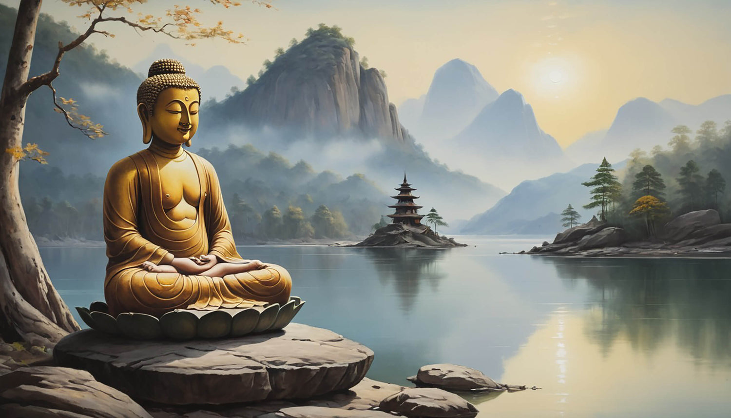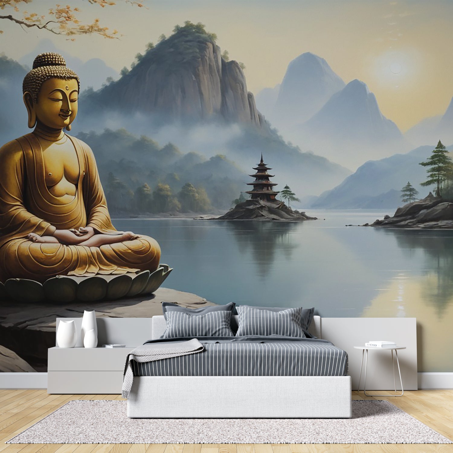 Papel Pintado Mural Japonés | Buda Zen con Lago de Montaña