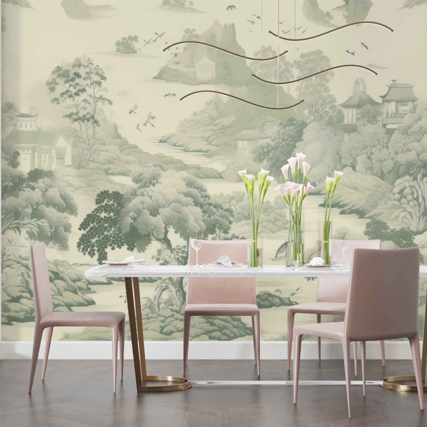 Papel Pintado Mural Jardín Japonés | Paisaje Montañoso Sereno en Verde Salvia