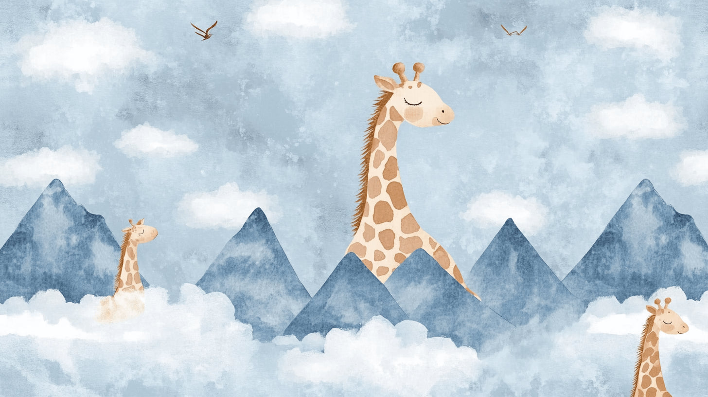 Este mural de papel pintado de jirafas crea un paisaje de ensueño encantador donde gigantes gentiles deambulan entre picos montañosos brumosos. El diseño estilo acuarela presenta encantadoras jirafas beige con expresiones amigables, situadas sobre un fondo de suaves montañas azul grisáceas y nubes blancas esponjosas. Pájaros delicados vuelan por el cielo tranquilo, añadiendo movimiento a este papel pintado safari para habitación infantil que captura el equilibrio perfecto entre fantasía y serenidad.