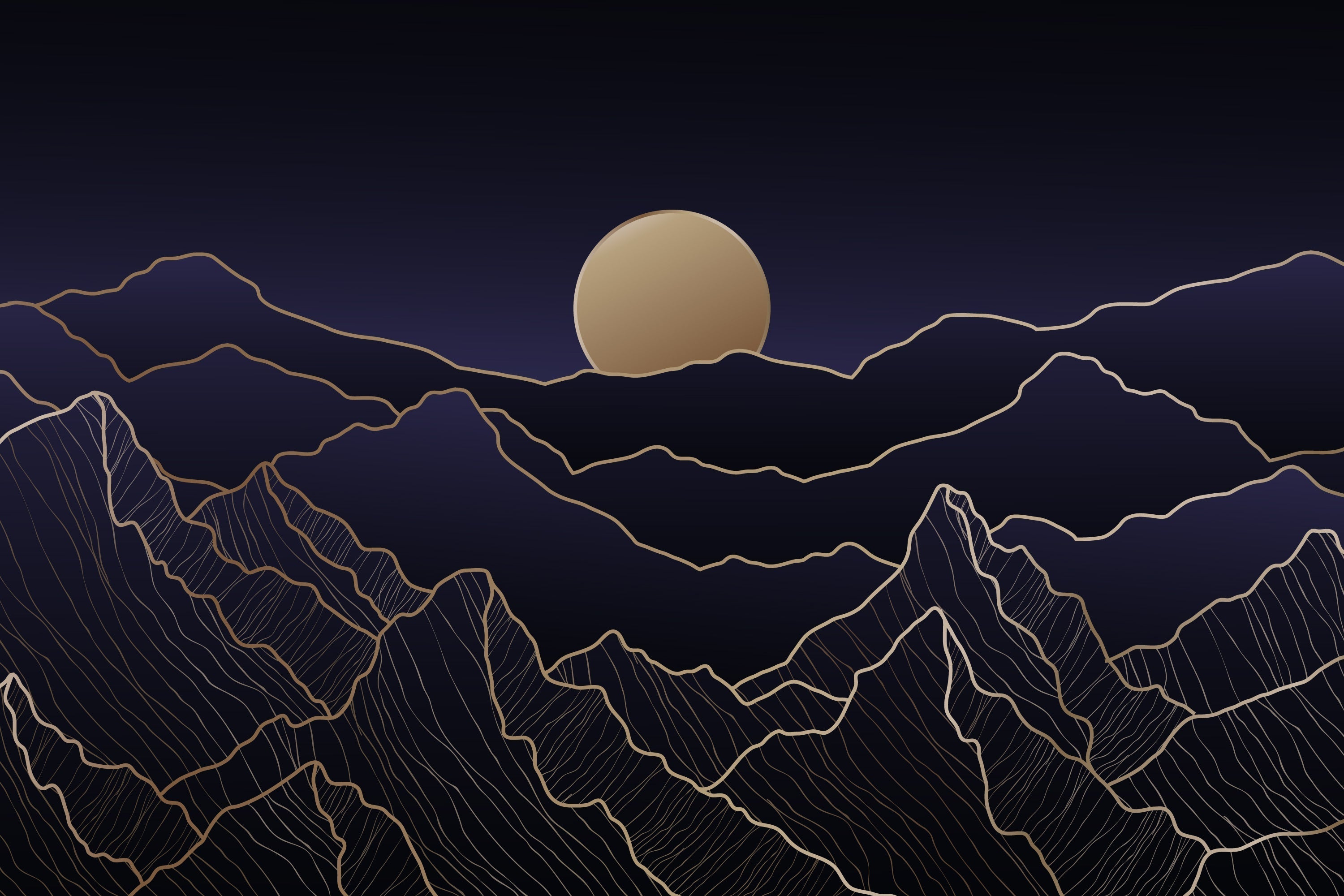Este papel pintado de paisaje montañoso captura la serena majestuosidad de una cordillera iluminada por la luna a través de un elegante arte lineal. El diseño presenta delicados contornos dorados que trazan picos escarpados contra un fondo azul marino profundo, creando una sofisticada interacción de luz y sombra. La luna dorada se eleva magníficamente sobre el papel pintado de montaña abstracta, proyectando su cálido resplandor sobre el paisaje montañoso en capas.