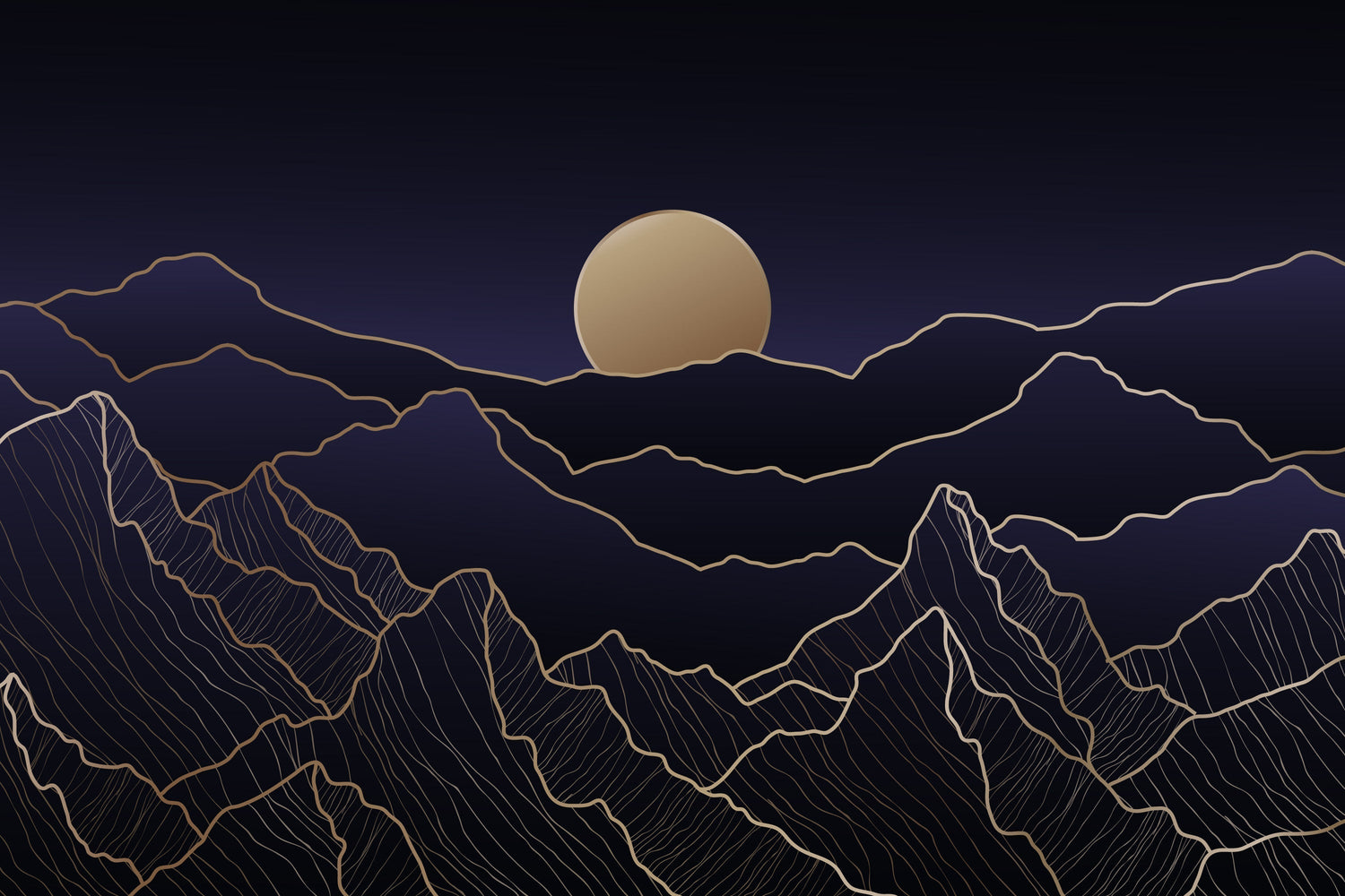 Papel Pintado Mural de Montaña | Arte de Línea Dorada sobre Cielo Nocturno Azul Marino