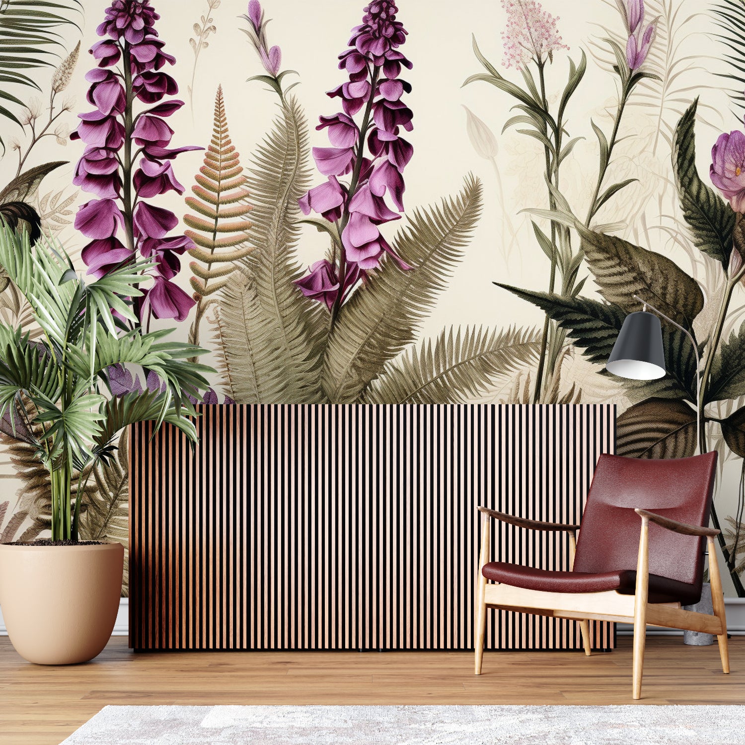 Papel Pintado Mural Floral | Dedaleras Moradas con Helechos Beige