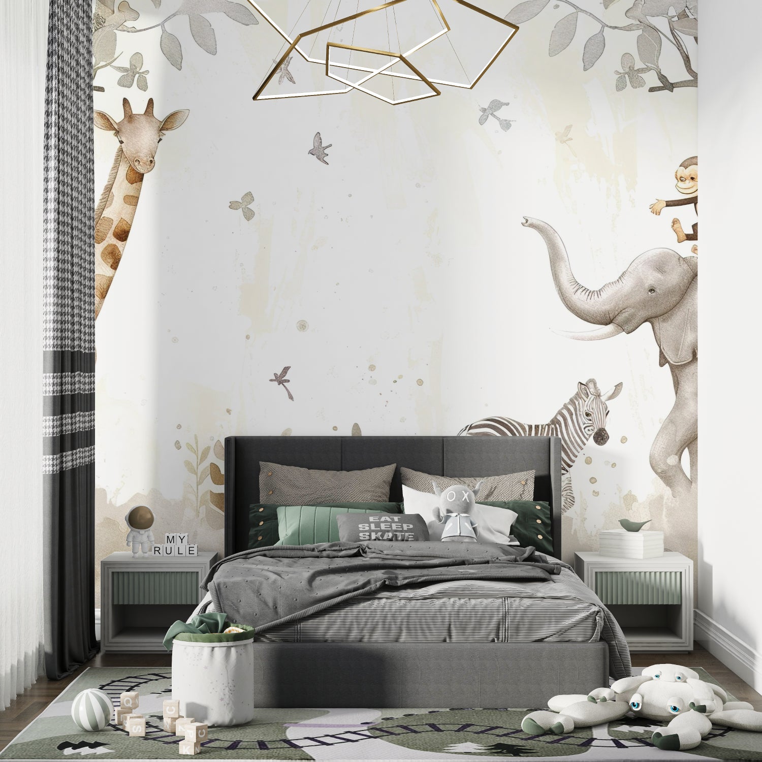 Perfecto para crear una pared destacada de papel pintado safari para niños, este mural inspira imaginación y aventura mientras mantiene una estética sofisticada. La paleta de colores neutros asegura que este papel pintado de animales para habitación infantil se integre perfectamente en cualquier esquema de diseño interior, convirtiéndolo en una elección ideal para guarderías, dormitorios infantiles o salas de juegos donde tanto el estilo como la narración son importantes.