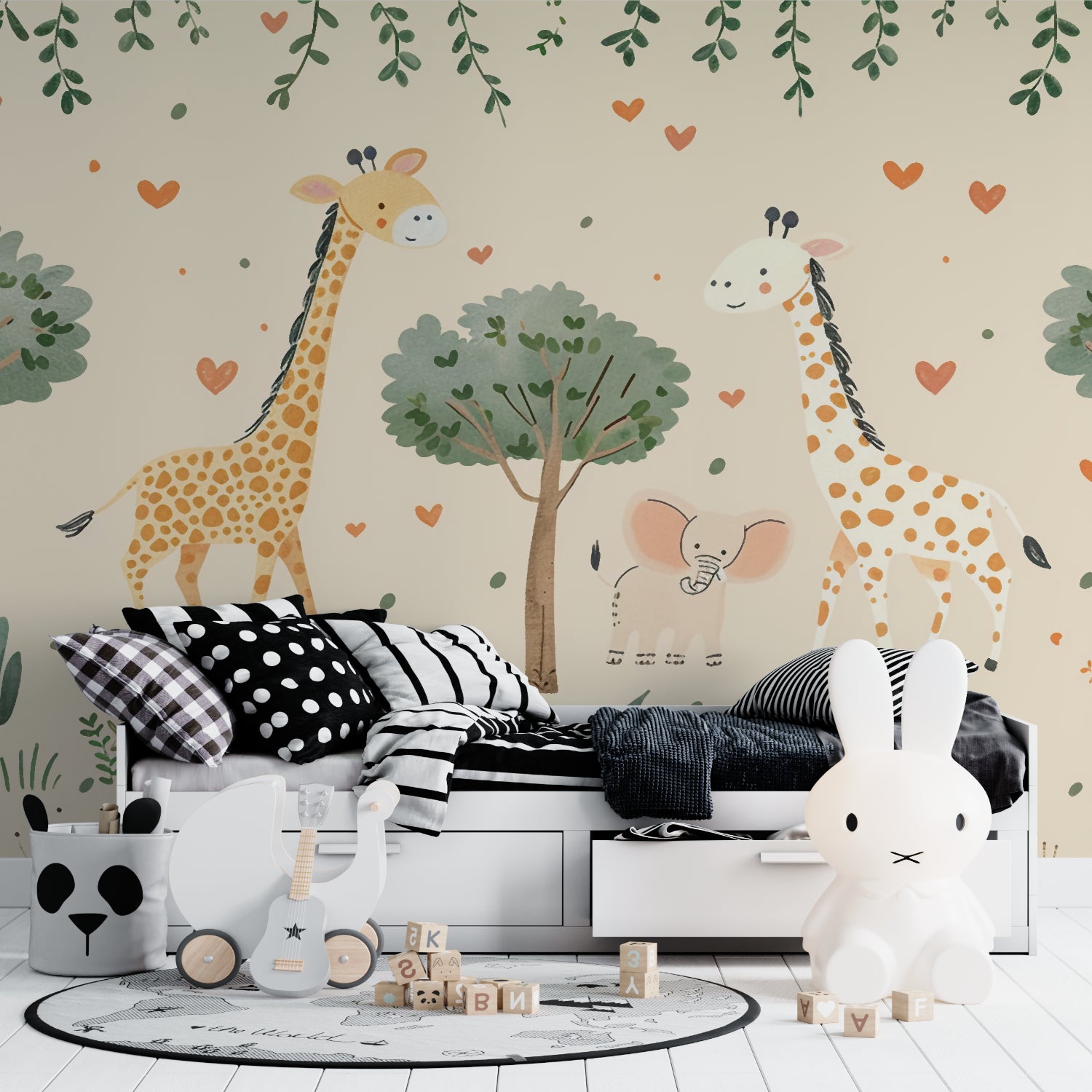 Papel Pintado Mural de Animales Safari | Diseño de Jirafas Lindas y Corazones