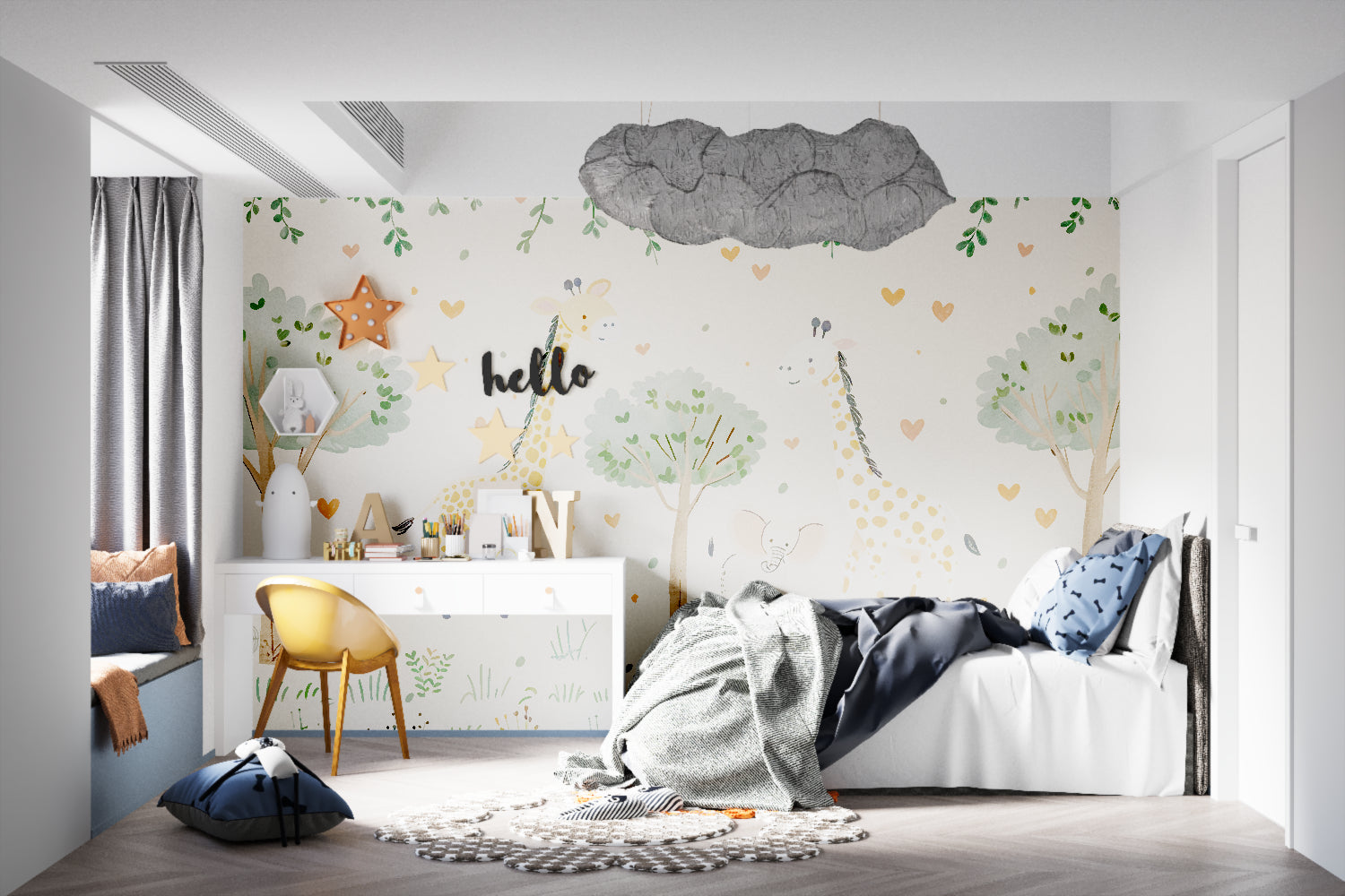 Transforma cualquier espacio en un refugio acogedor con este papel pintado safari para niños. La paleta de colores suaves de beige, naranja y verde apagado crea un ambiente relajante que crece con tu hijo. Este papel pintado de animales para habitación infantil ofrece versatilidad para varias habitaciones, proporcionando un fondo perfecto tanto para momentos tranquilos como para aventuras juguetonas, manteniendo una estética sofisticada que los padres apreciarán.