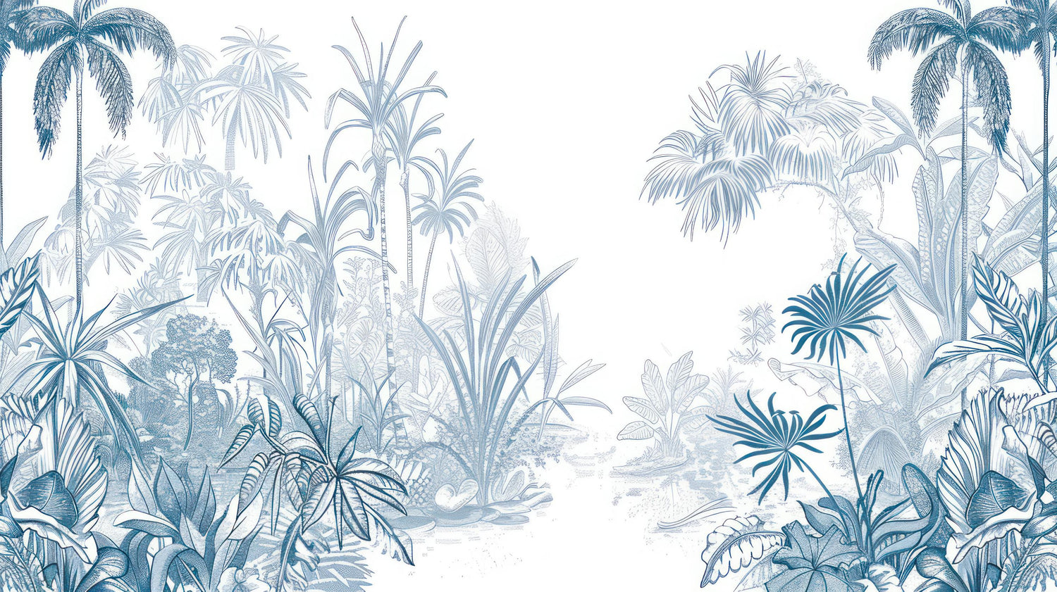 Este papel pintado tropical de palmeras presenta un diseño panorámico elegante donde gráciles palmeras emergen en diferentes tonos de azul sobre un fondo blanco inmaculado. La ilustración detallada en línea captura la majestuosa belleza de las hojas exóticas de palmera, creando una profundidad sofisticada mediante un delicado boceto y degradados pensados. Cada elemento, desde las altas frondas de palmera hasta el sutil follaje tropical, contribuye a una composición serena y refinada.