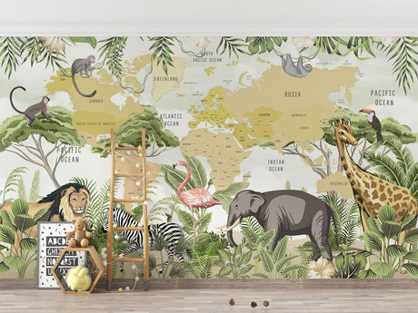 Papier Peint Mural Carte du Monde | Design Éducatif Animaux pour Enfants
