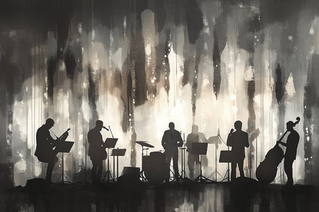 Papier Peint Mural Musique | Silhouettes de Groupe de Jazz sur Fond Gris Abstrait