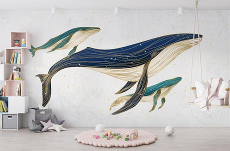 De £28.90£33.90Prix unitaire /IndisponiblePapier Peint Mural Animaux Marins | Élégante Famille de Baleines avec Lignes Dorées