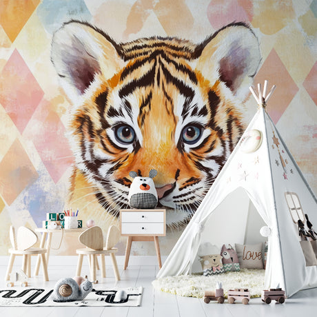 Papier Peint Mural Tigre | Design Géométrique Pastel en Fond