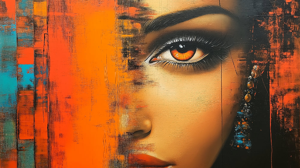 Ce papier peint portrait abstrait présente une vision artistique fascinante où un œil expressif devient le point focal d'une composition dramatique. L'iris ambre saisissant se détache sur un détail noir profond, tandis que des tons vibrants d'orange et de turquoise créent un arrière-plan dynamique et texturé. Le papier peint abstrait moderne utilise un mélange magistral d'art urbain et de profondeur émotionnelle, avec des effets usés et des transitions de couleurs audacieuses qui reflètent les sensibilités esthétiques contemporaines.