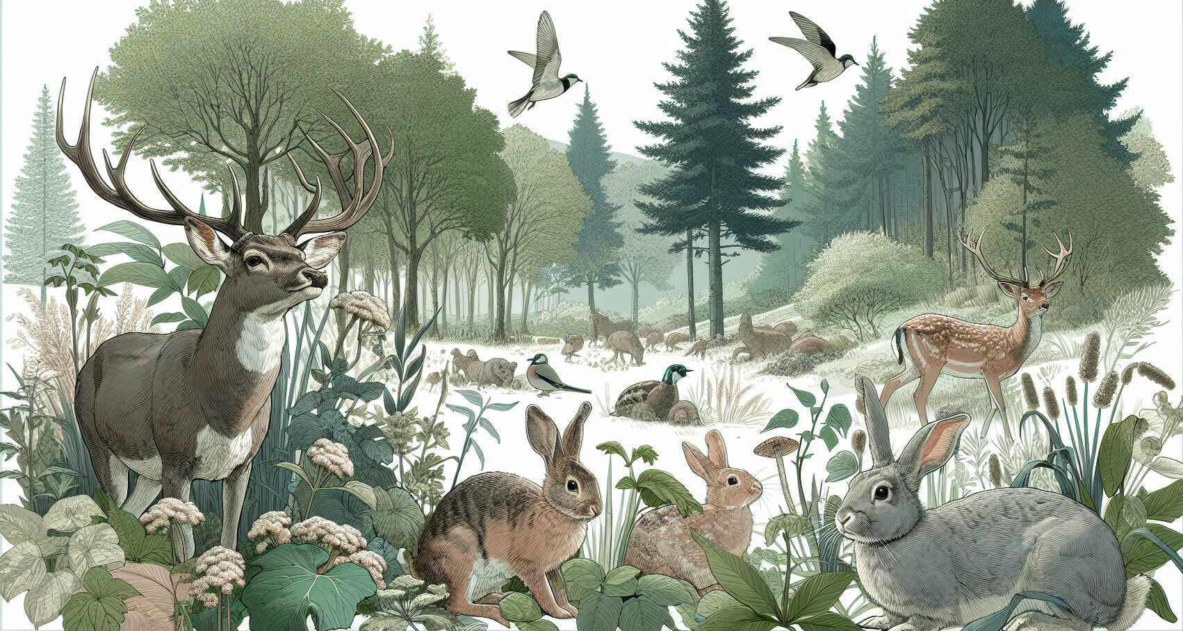 Papier Peint Mural Animaux de la Forêt | Scène Forestière avec Cerfs et Lapins