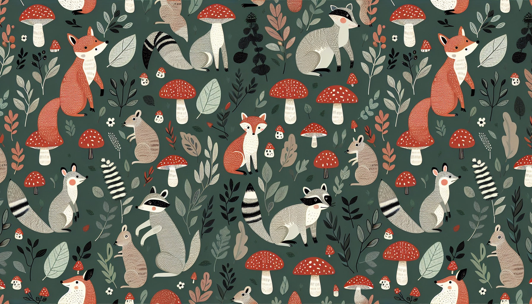 Ce papier peint animaux de la forêt enchanteur crée une scène boisée féerique sur un fond vert profond. Des renards charmants en orange rustique, des ratons laveurs joueurs et des créatures forestières douces sont artistiquement disposés parmi des champignons rouges tachetés et un feuillage délicat. Le papier peint animaux de la forêt présente une palette de couleurs sophistiquée de vert forêt, terracotta chaud et beige doux, avec une texture détaillée qui donne vie à chaque créature.
