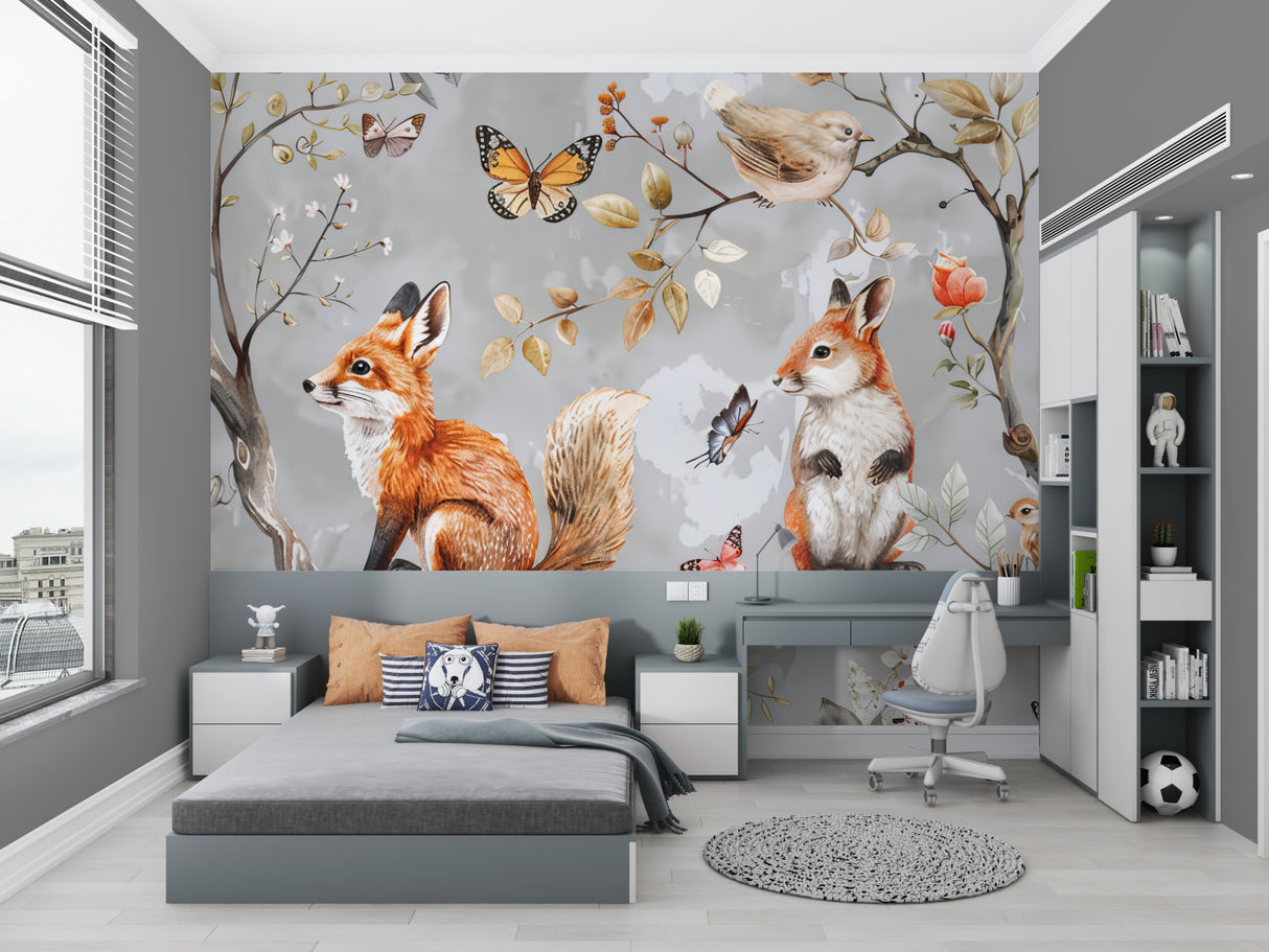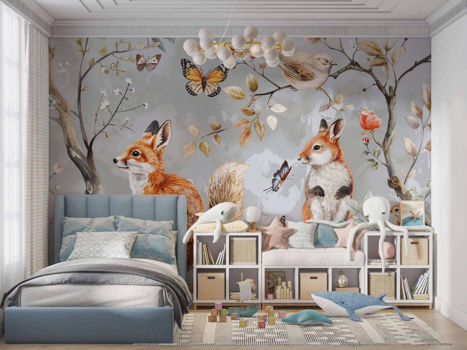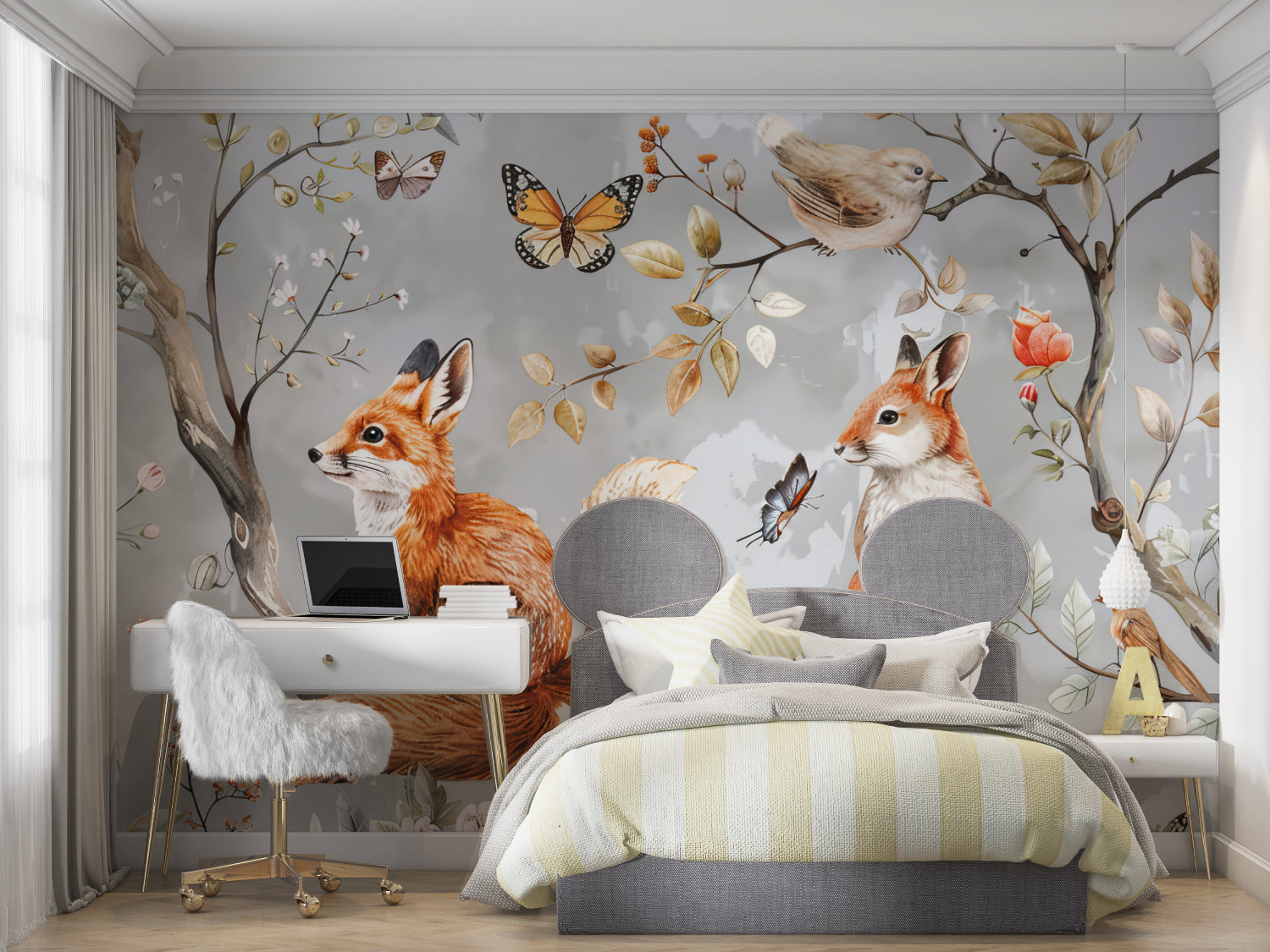 Papier Peint Mural Animaux de la Forêt | Renard des Bois et Papillons en Gris