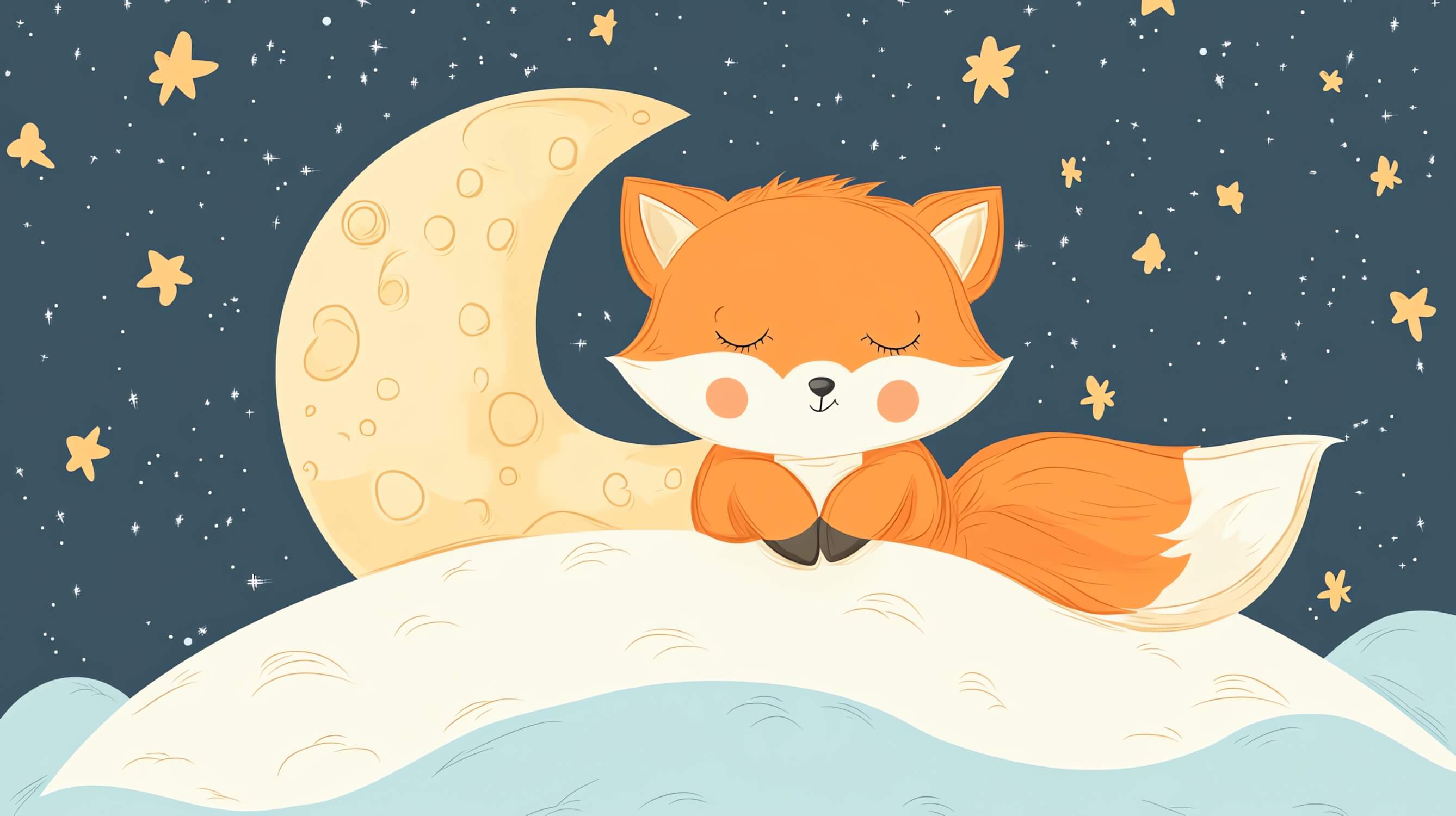 Ce papier peint renard enchanteur présente une scène charmante de forêt où un renard doux se repose paisiblement sur un fond d'une lune croissante lumineuse. Placé sur un ciel bleu sarcelle profond parsemé d'étoiles dorées, le design capture une atmosphère nocturne magique. Le renard endormi, rendu en tons orange chauds avec des détails délicats, crée un papier peint animal pour chambre d'enfant qui incarne à la fois fantaisie et tranquillité.