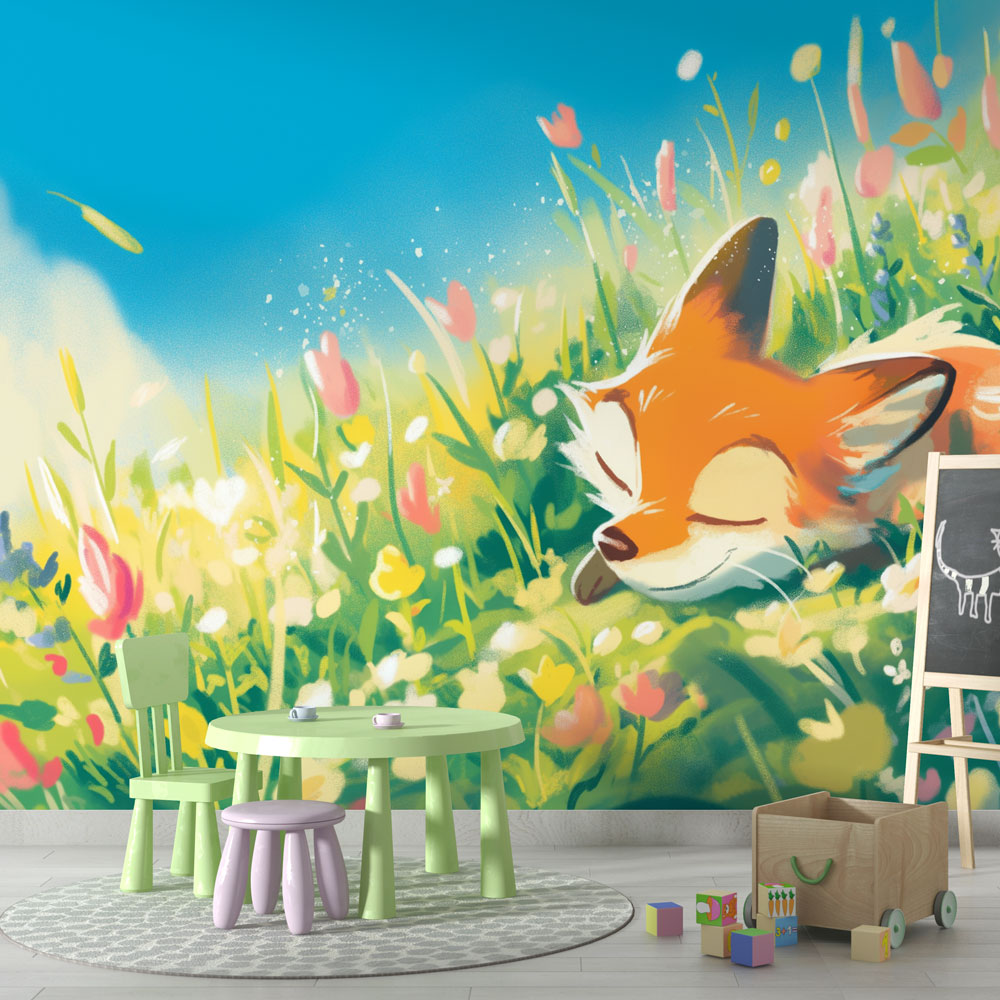 Papier Peint Mural Animaux de la Forêt | Renard Endormi dans une Prairie de Printemps