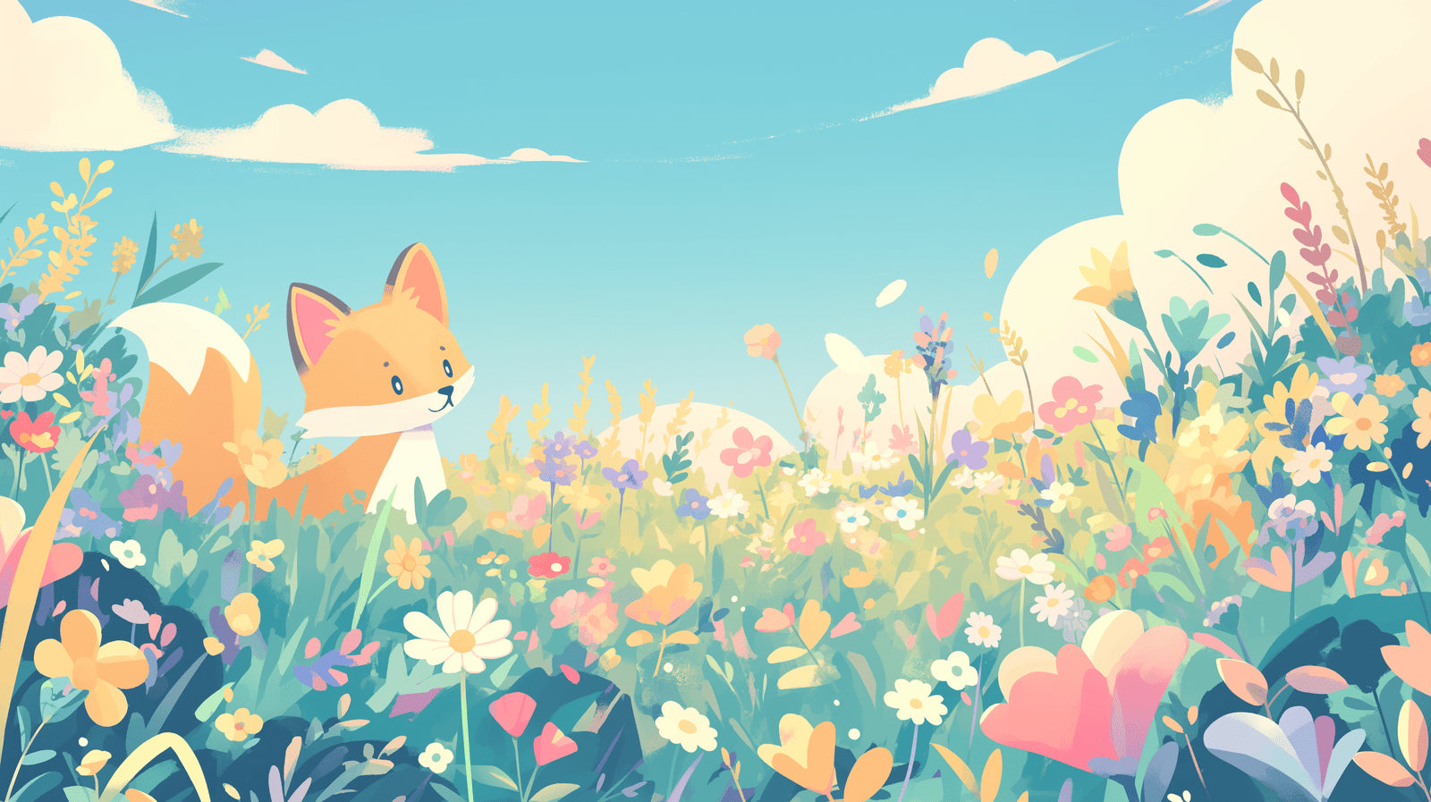Ce charmant papier peint animal de la forêt présente un adorable renard au milieu d'une prairie de fleurs sauvages vibrante sous un ciel turquoise serein. L'illustration délicate met en scène un renard orange doux aux yeux bleu vif, sur un fond de rêve composé d'éléments de papier peint floral aux pastels doux. Des marguerites, des coquelicots et des fleurs sauvages dans des tons de rose, violet, jaune et blanc créent une scène de jardin magique, tandis que des nuages blancs vaporeux dérivent paisiblement au-dessus.