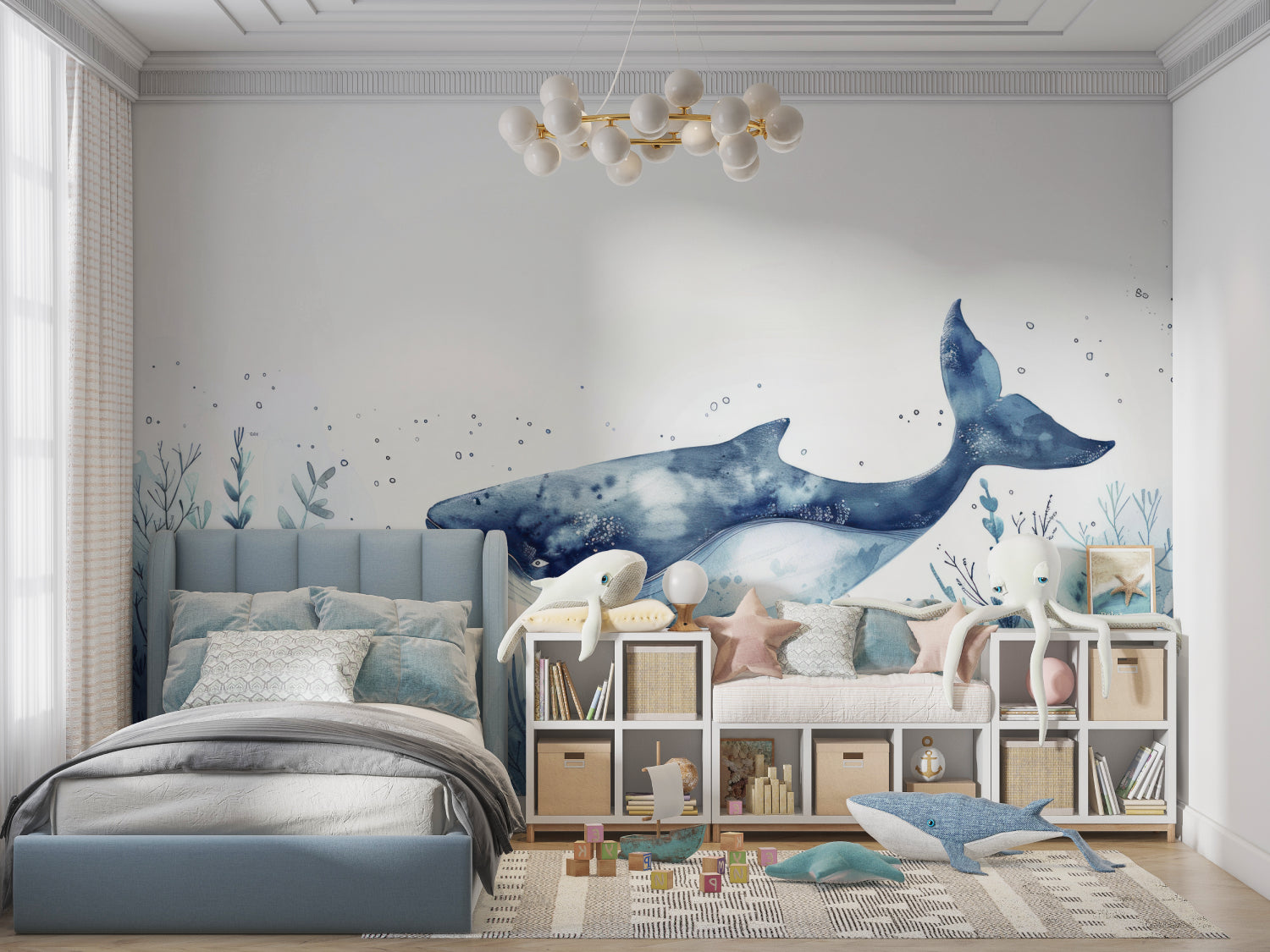 Les bleus doux et le design fluide rendent ce papier peint à thème océan naturellement apaisant.