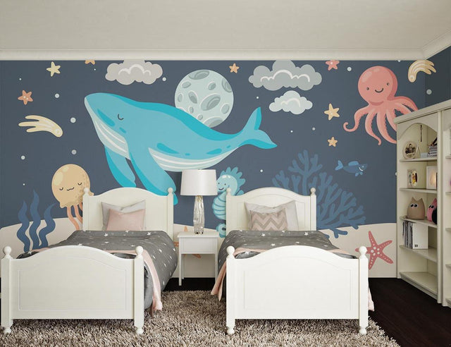 Ce papier peint animaux marins enchanteur crée un sanctuaire sous-marin de rêve avec son charmant casting de créatures marines. Une douce baleine bleue flotte sous une lune lumineuse, accompagnée d'une pieuvre corail amicale, d'un hippocampe turquoise et d'une méduse joyeuse. Sur un fond bleu marine profond parsemé de nuages doux et d'étoiles scintillantes, ce papier peint thème océan mélange des éléments sous-marins et célestes d'une manière magiquement unique.