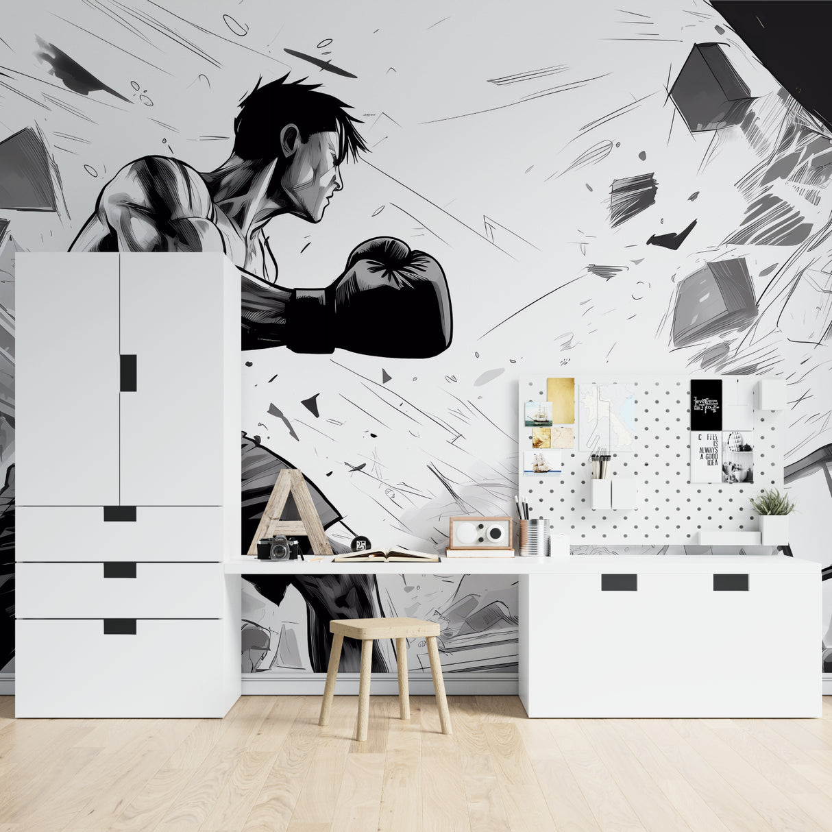 Papier Peint Mural Anime | Scène de Boxe en Noir et Blanc