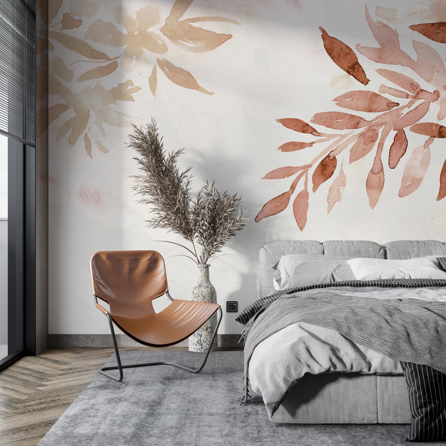 Papier Peint Mural Aquarelle | Feuilles Botaniques Terracotta