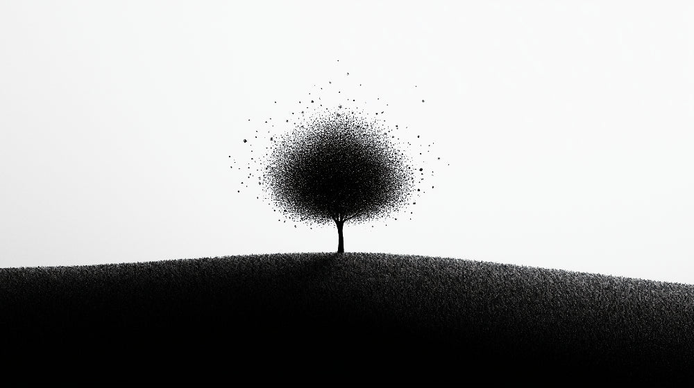 Ce papier peint arbre minimaliste capture l'essence de la simplicité artistique à travers une composition monochromatique saisissante. Sur un fond blanc immaculé, la silhouette solitaire d'un arbre se dresse fièrement sur une colline ondulante, sa cime se dispersant en un nuage fascinant de particules délicates. La fresque murale noire et blanche démontre un contraste magistral, où chaque point dispersé contribue à un affichage dynamique de poésie visuelle.