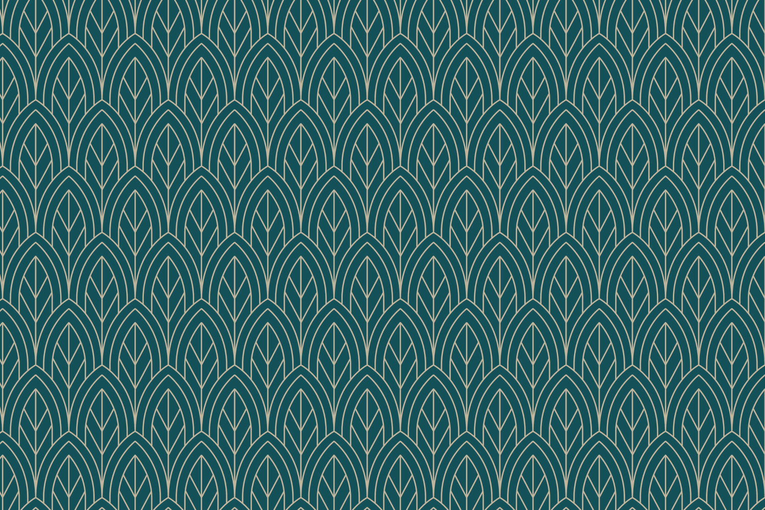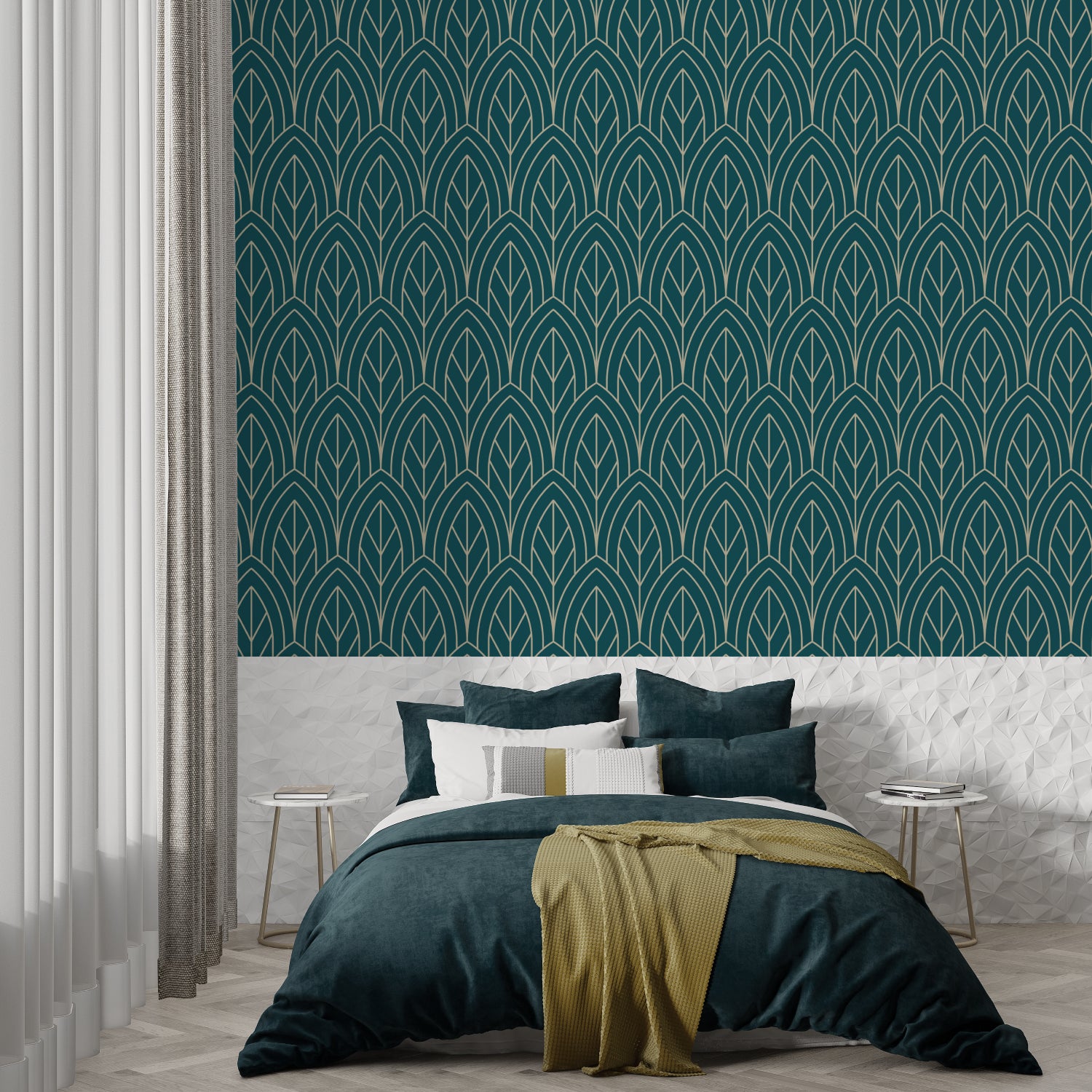 Le fond bleu sarcelle profond crée une toile parfaite pour que le motif art déco brille.
