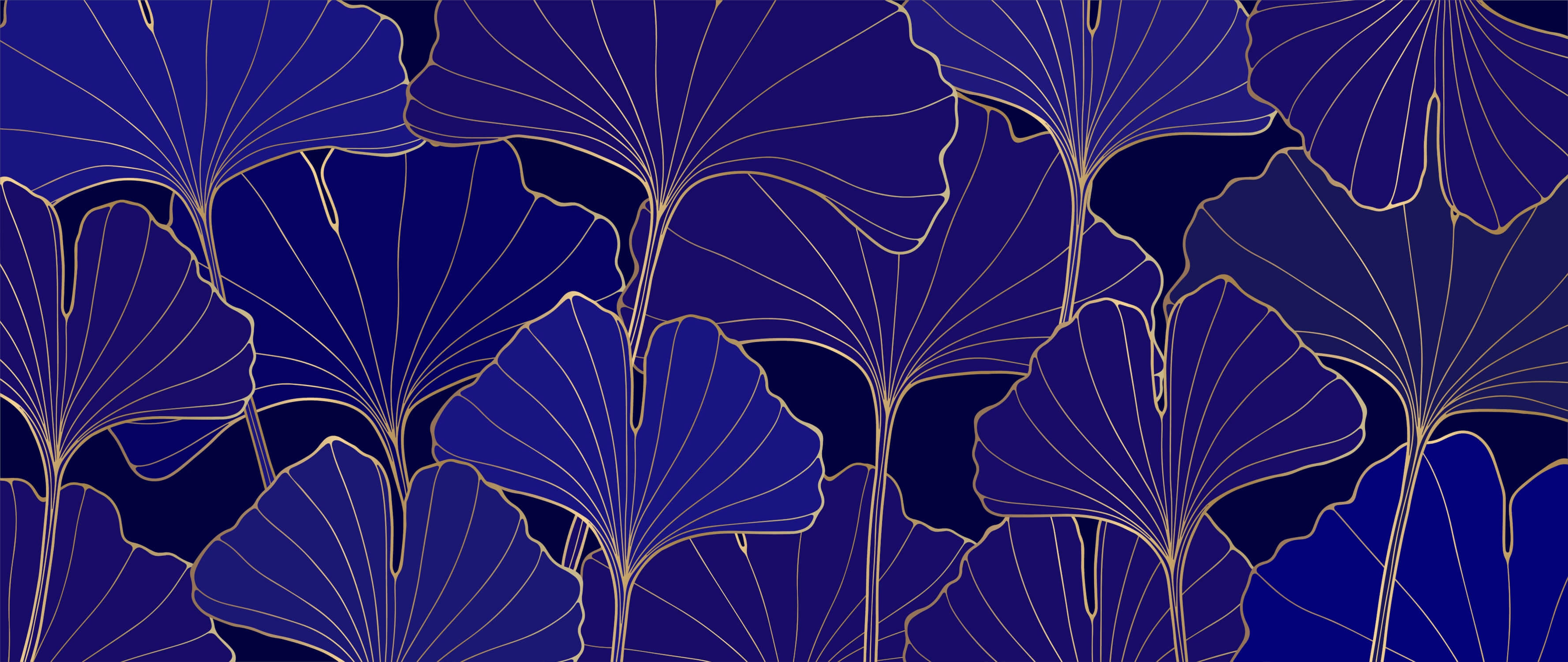 Papier Peint Mural Art Déco | Feuilles de Ginkgo Bleu Marine et Or