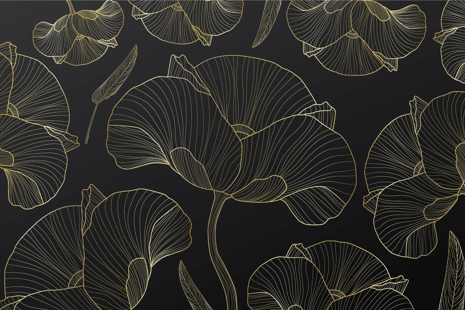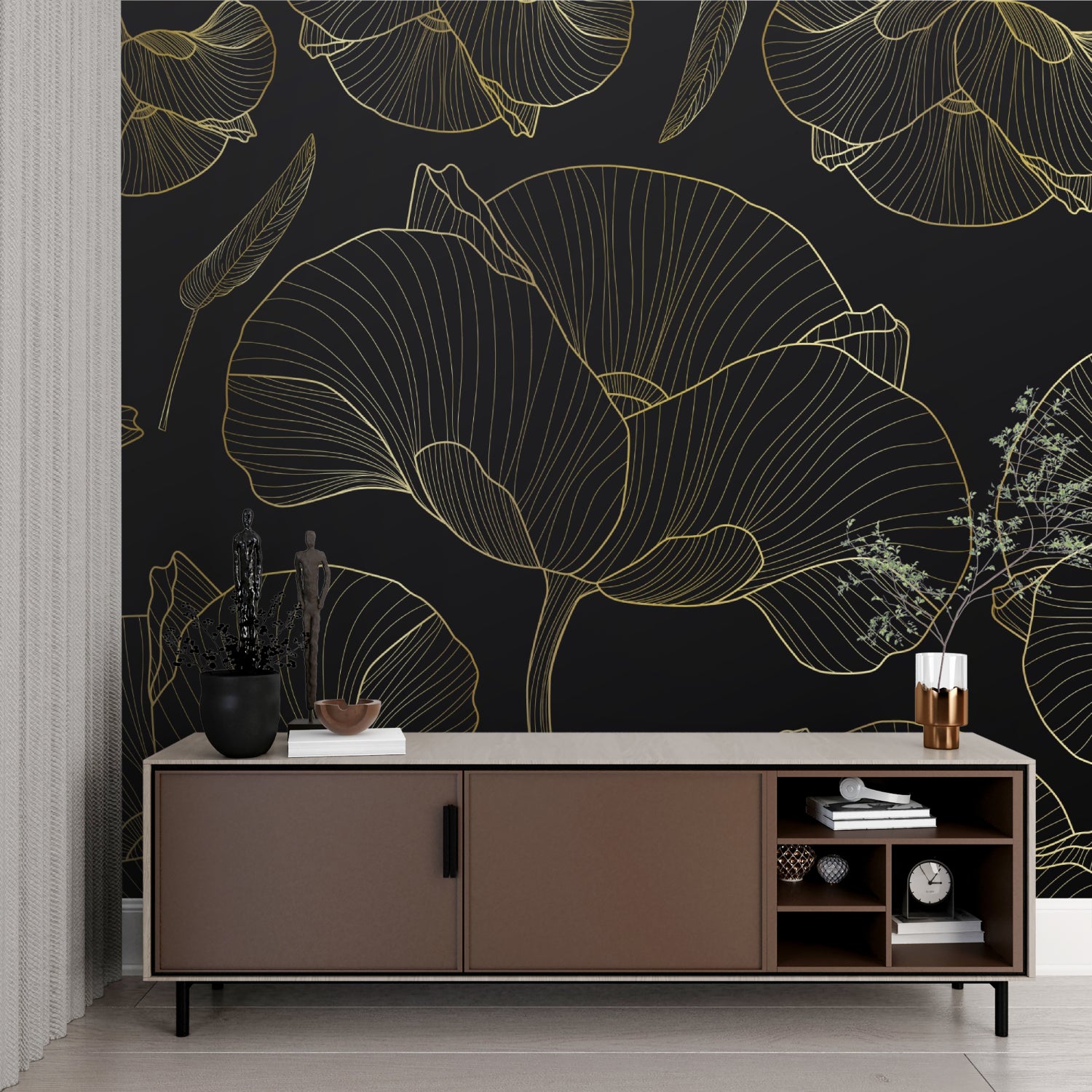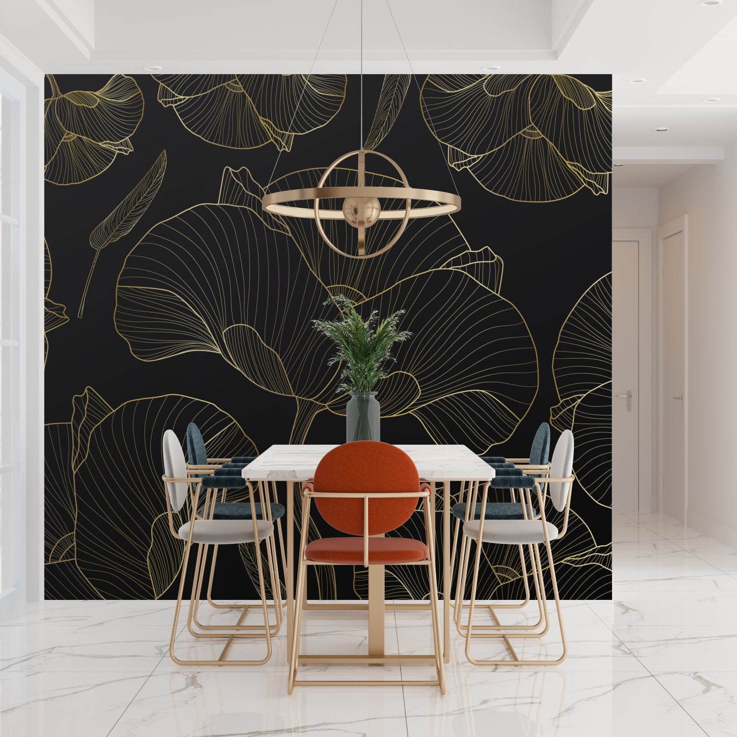 Papier Peint Mural Art Déco | Feuilles de Ginkgo Dorées sur Fond Noir