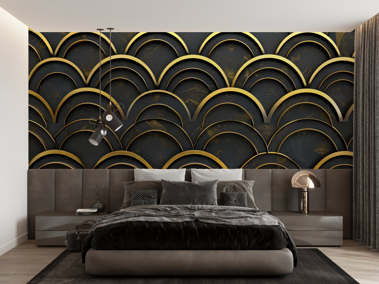 Ce papier peint art déco présente un motif répété sophistiqué d'arcs dorés brillants sur un fond noir profond. La bordure métallique dorée crée un effet tridimensionnel, tandis que des détails texturés subtils et de délicates taches dorées ajoutent de la profondeur et du luxe au papier peint géométrique. Chaque arc est méticuleusement délimité, créant un motif en éventail en cascade qui capte la lumière et le mouvement dans une danse élégante d'ombres et de reflets.