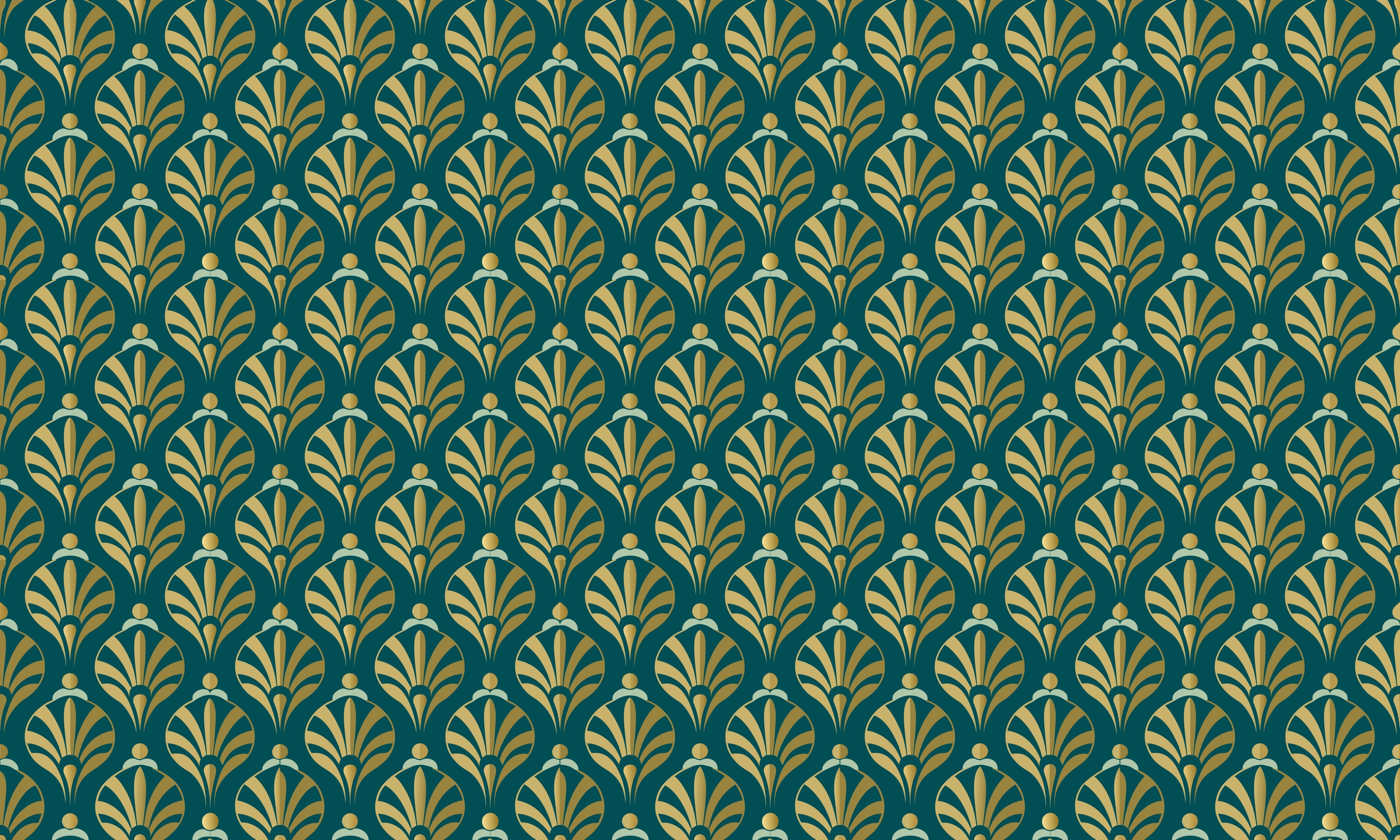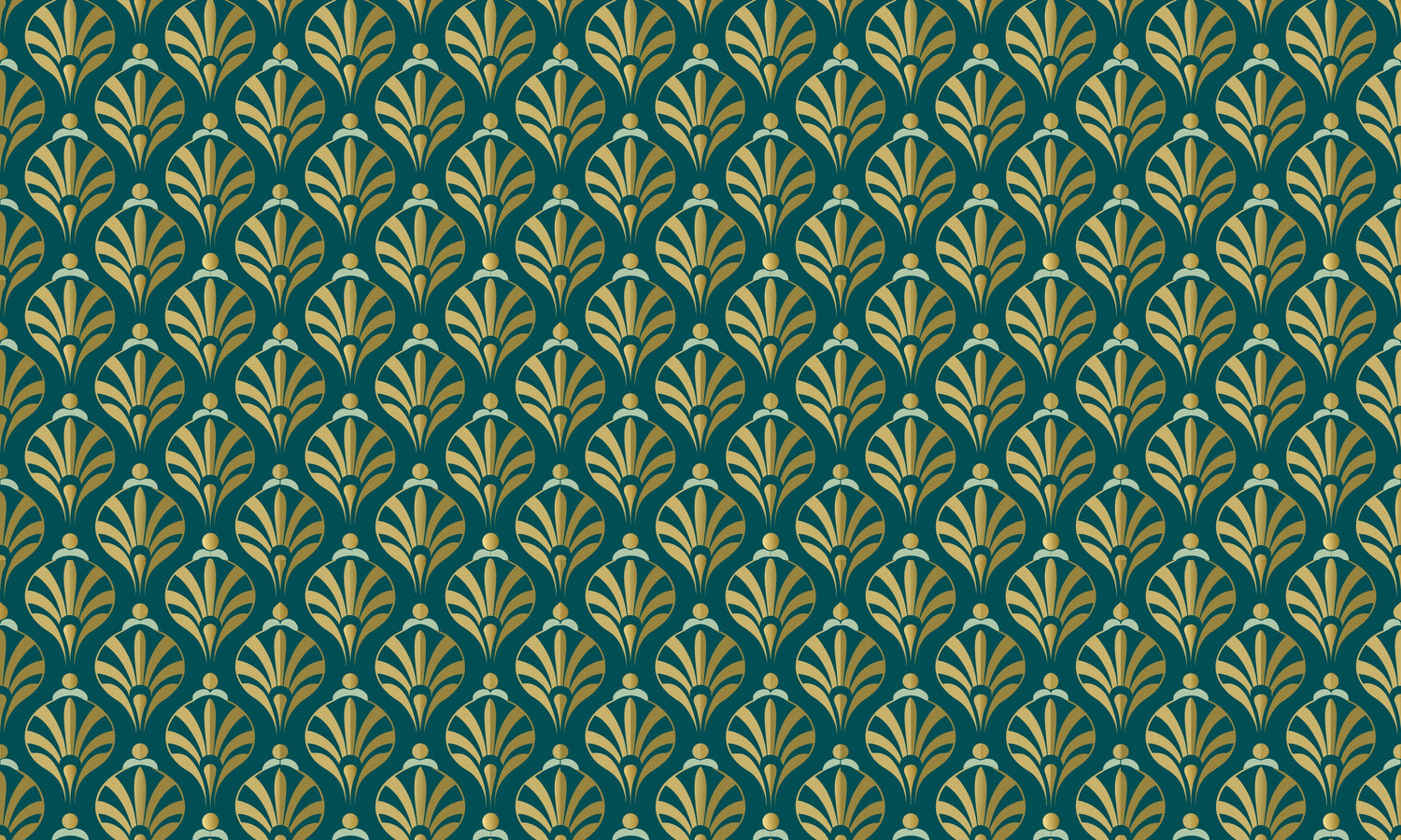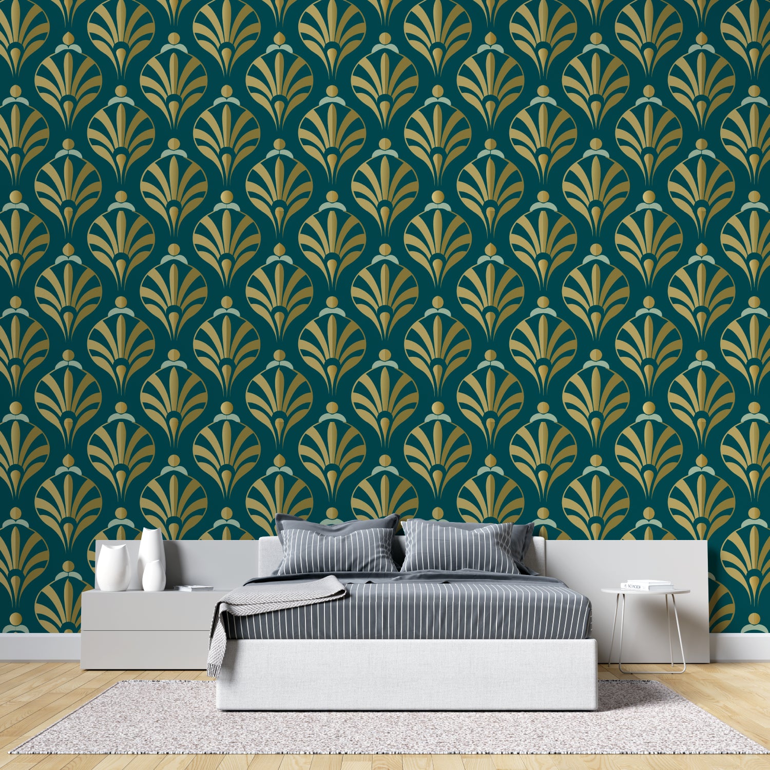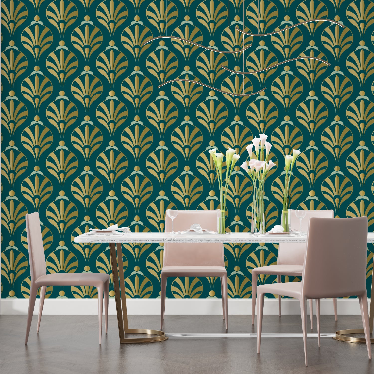 Papier Peint Mural Art Déco | Motif Éventail Doré sur Bleu Sarcelle