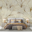 Ce papier peint art déco présente un design enchanteur de lignes courbes balayantes en or éclatant sur un fond beige doux. Le motif complexe comporte des formations en éventail qui créent un rythme fascinant à travers le mur, rappelant les motifs délicats de papier peint plume. Chaque ligne dorée coule avec précision et grâce, formant une danse élégante de lumière et d'ombre qui capture l'essence du design art déco classique.