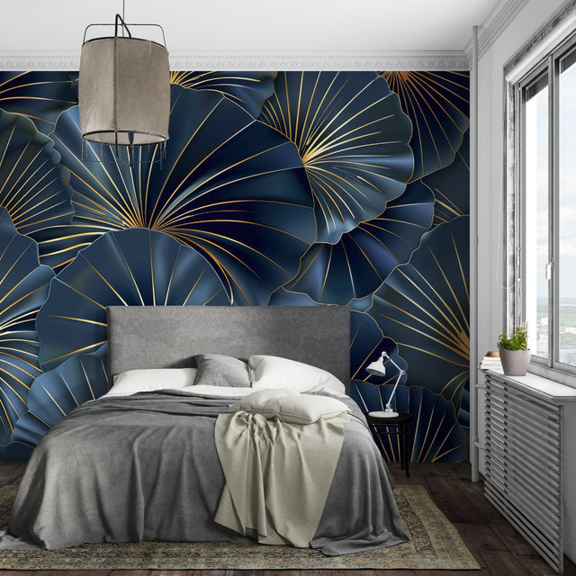 Papier Peint Mural Art Déco | Motif Éventail Bleu Marine et Or