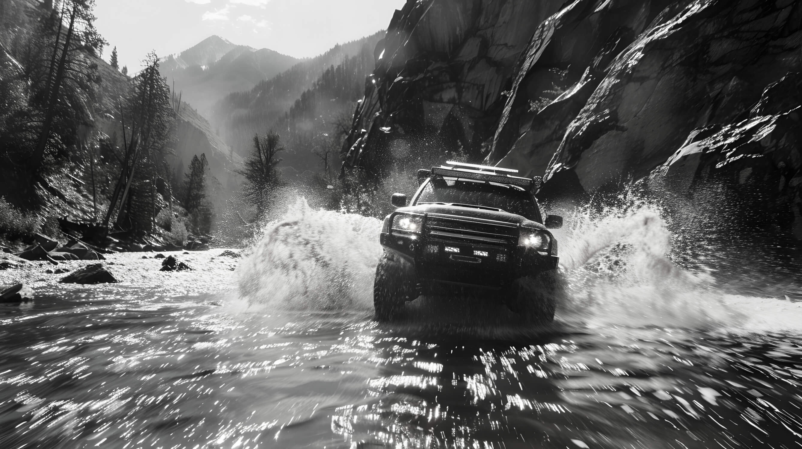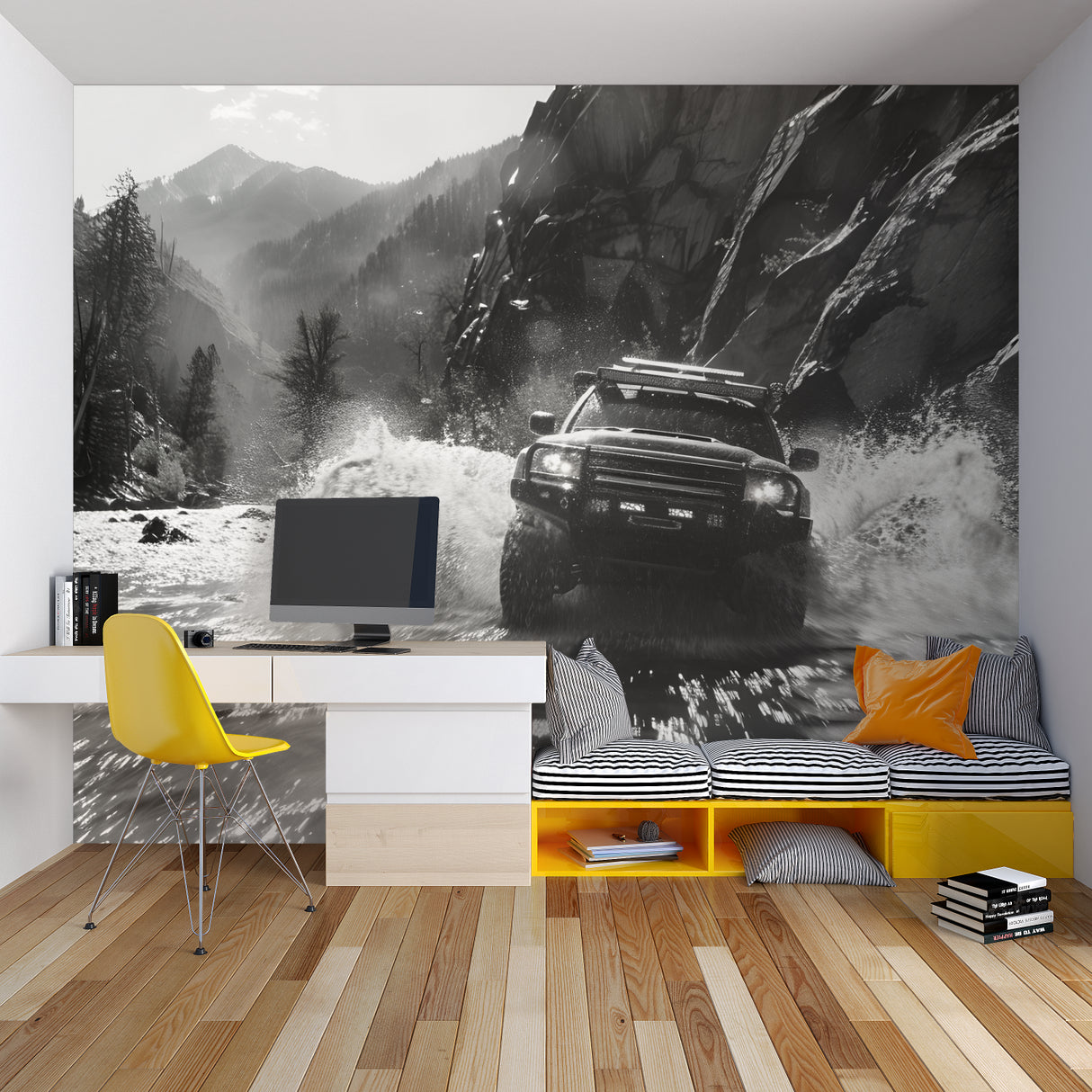 Ce papier peint de rallye noir et blanc capture l'énergie brute de l'aventure dans une scène monochromatique dramatique. Sur fond de sommets montagneux majestueux enveloppés de brume, un puissant véhicule tout-terrain traverse une eau tumultueuse, créant des éclaboussures dynamiques qui jaillissent du paysage dramatique. Le papier peint montagne dramatique met en valeur l'équilibre parfait entre une action intense et le décor serein de la nature sauvage.