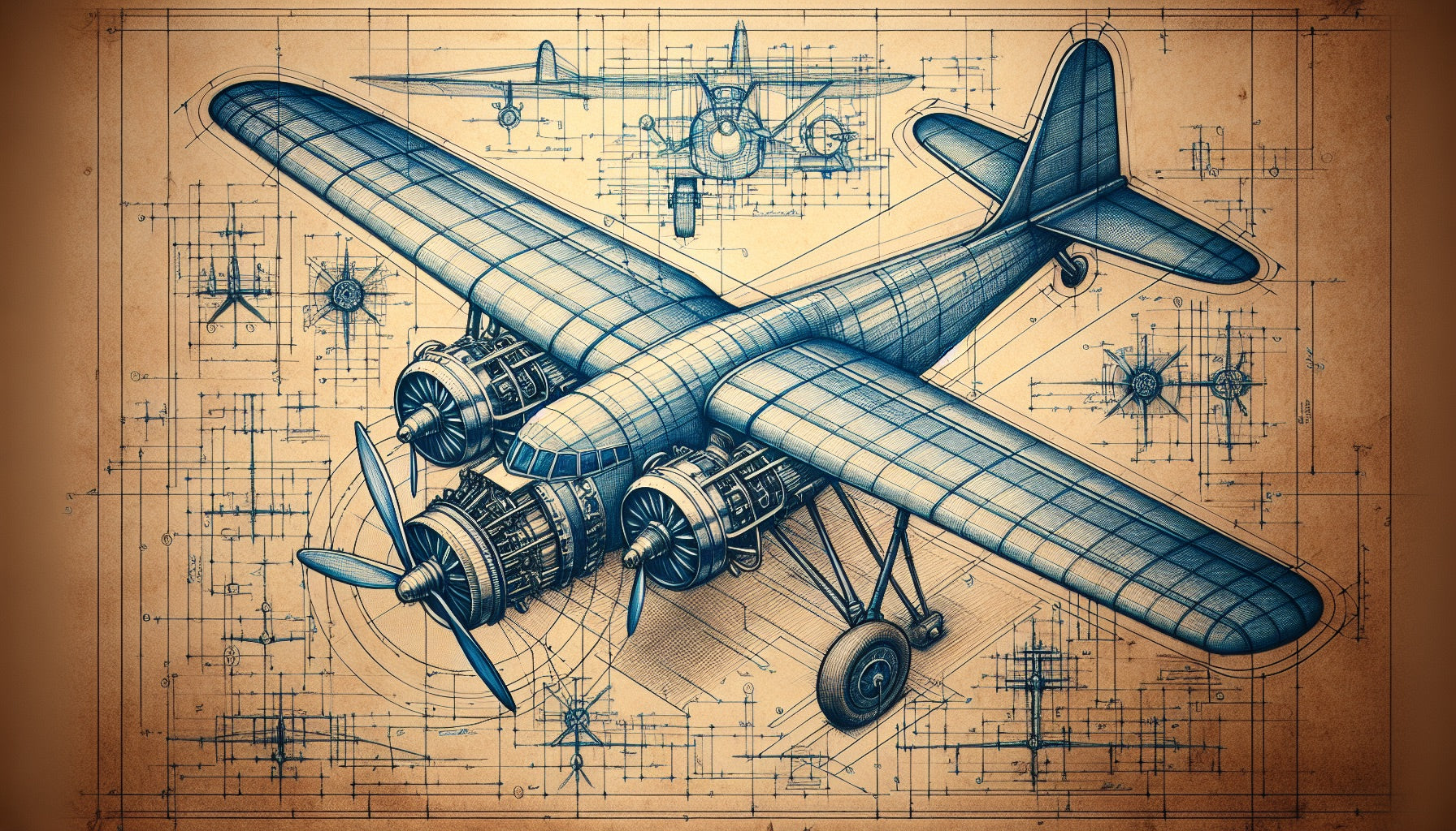 Ce papier peint avion vintage présente une illustration extraordinaire de plan technique sur un fond sépia chaud. Le dessin d'ingénierie détaillé montre un avion bimoteur rendu en tons bleus saisissants, avec des spécifications mécaniques complexes, des mesures précises et plusieurs vues en perspective. Le papier peint plan d'aviation allie excellence artistique et précision technique, créant une esthétique industrielle sophistiquée.