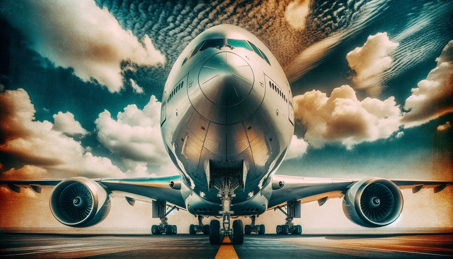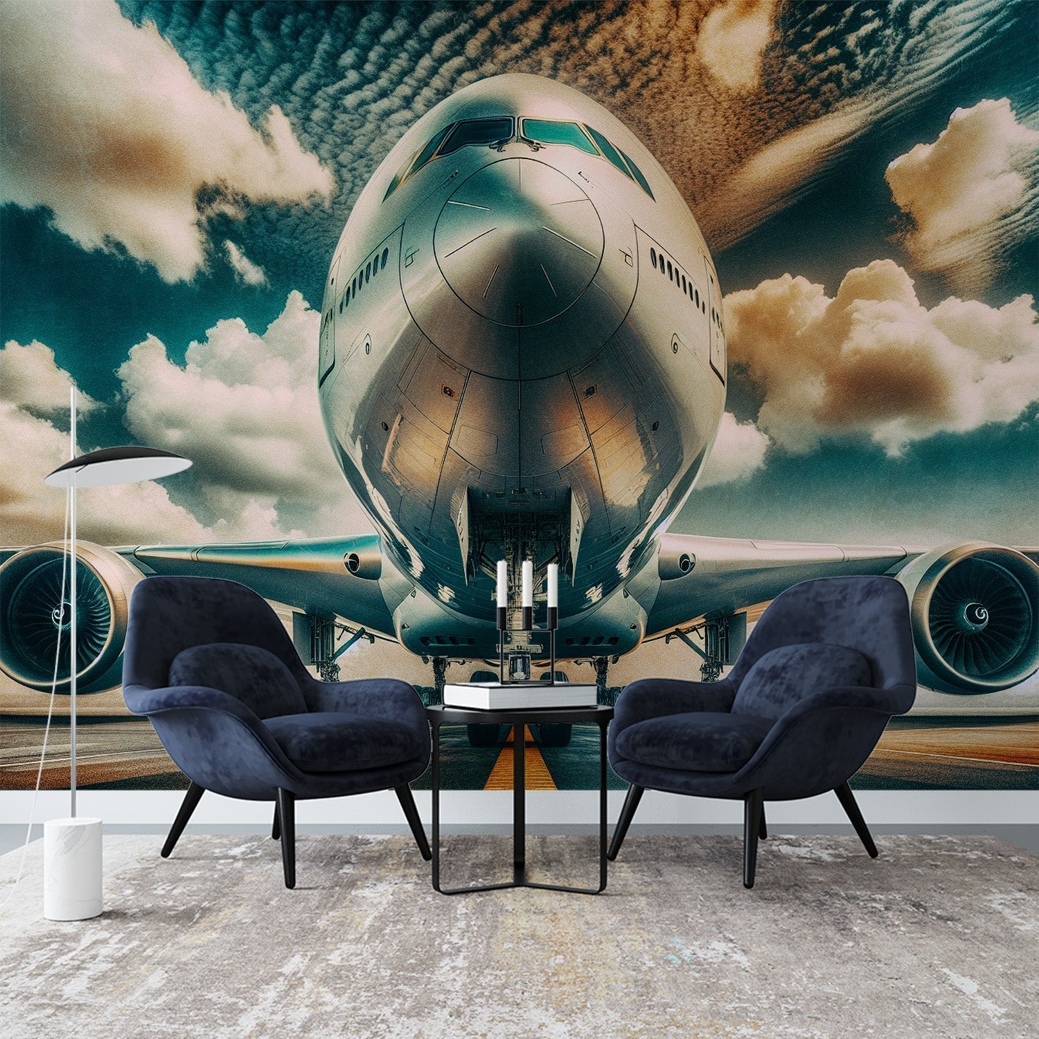 Cette fresque murale d'avion présente une vue frontale impressionnante d'un avion moderne contre un ciel dramatique. Le fuselage argenté brille avec la lumière réfléchie, tandis que de puissants moteurs à turbine encadrent la composition. Sur un fond époustouflant de nuages turquoise et ambre, ce papier peint aviation capture la puissance brute et la merveille d'ingénierie du vol moderne avec sa perspective audacieuse en contre-plongée.