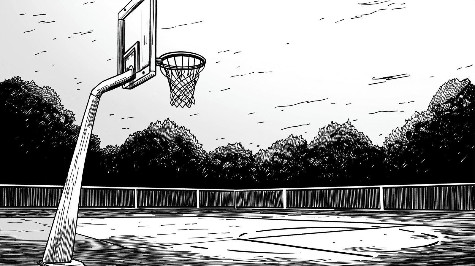 Ce papier peint de terrain de basketball présente une illustration saisissante en noir et blanc qui capture l'essence de la culture du basketball de rue. L'art linéaire détaillé dépeint une composition puissante mettant en scène un panier de basketball s'élevant devant un arrière-plan d'arbres imposants, créant un contraste audacieux entre le sport urbain et les éléments naturels. Le papier peint mural sportif utilise des techniques de croquis magistrales qui apportent profondeur et dimension à la scène du terrain extérieur.