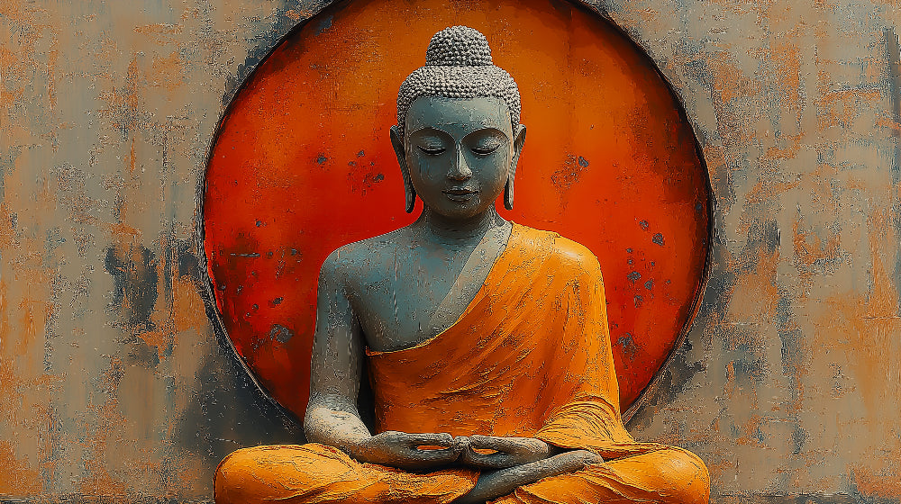Cette fresque murale Bouddha présente un mélange magistral de tranquillité et de profondeur artistique. La statue de Bouddha texturée en pierre grise est assise en méditation sereine devant un fond circulaire orange lumineux, créant une harmonie visuelle saisissante. Les textures détaillées de la robe traditionnelle en safran-orange contrastent magnifiquement avec l'apparence usée de la statue, tandis que le art mural zen est rehaussé par des effets subtils d'usure autour des bords.