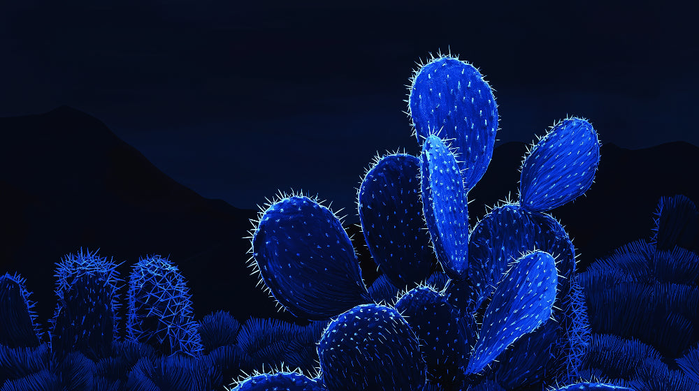 Ce papier peint cactus bleu présente une scène nocturne du désert fascinante où des cactus lumineux émergent de l'obscurité avec une brillance électrique. Les formes de figues de Barbarie brillent d'un éclat cobalt surnaturel, leurs épines minutieusement détaillées en blanc cristallin sur un fond de minuit profond. La fresque murale désertique crée un contraste saisissant qui capture la beauté mystérieuse de la flore désertique dans une interprétation artistique innovante.