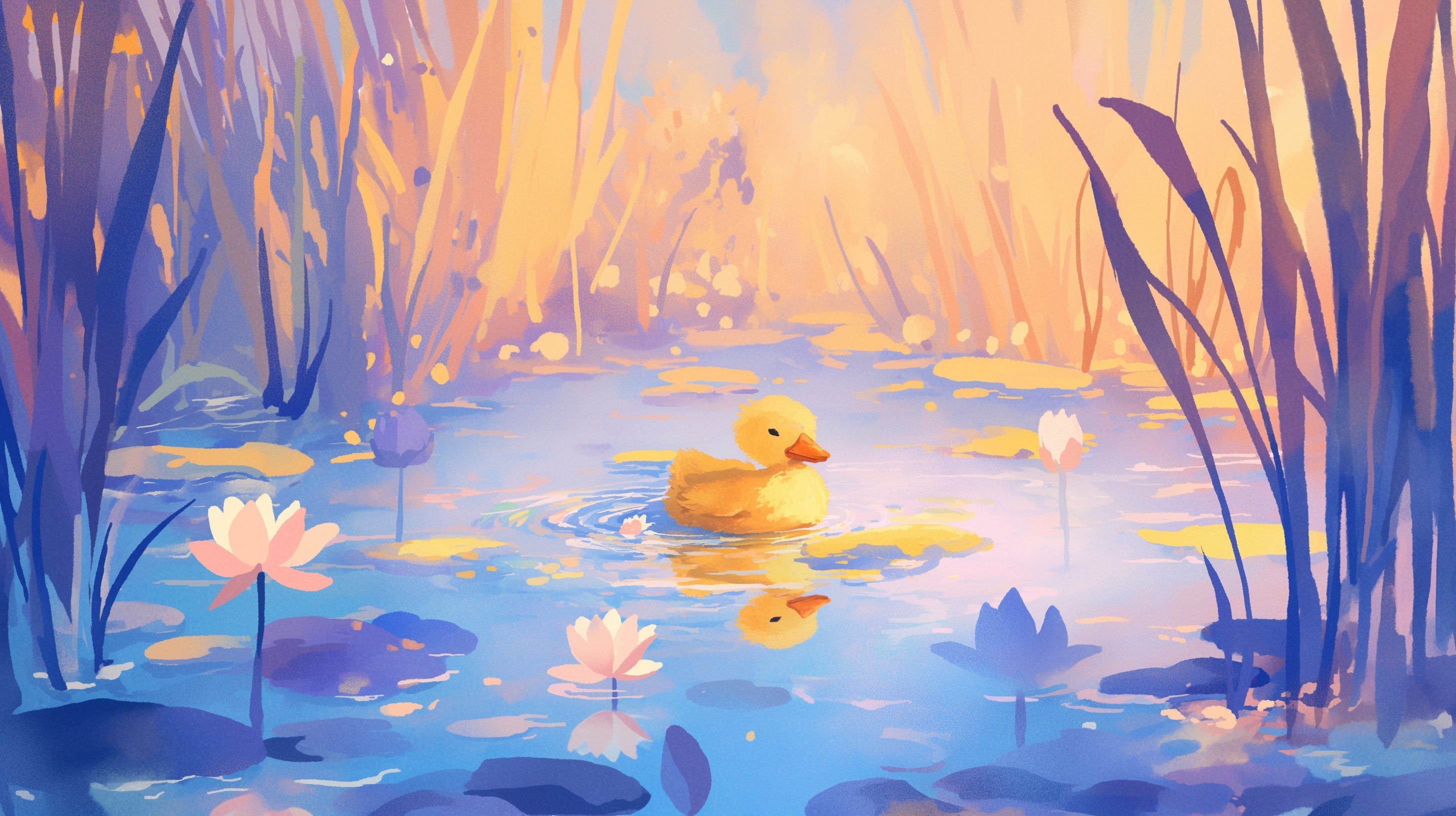 Ce papier peint étang aux canards capture une scène aquarelle sereine où un caneton doré glisse sur des eaux tranquilles. La composition rayonne de chaleur grâce à son mélange magistral de roseaux bleu-violet et de lumière dorée, créant une atmosphère éthérée. Des éléments délicats de papier peint nénuphar ajoutent des accents rose pâle contre la surface bleue réfléchissante, tandis que des coups de pinceau artistiques apportent mouvement et vie à chaque détail.