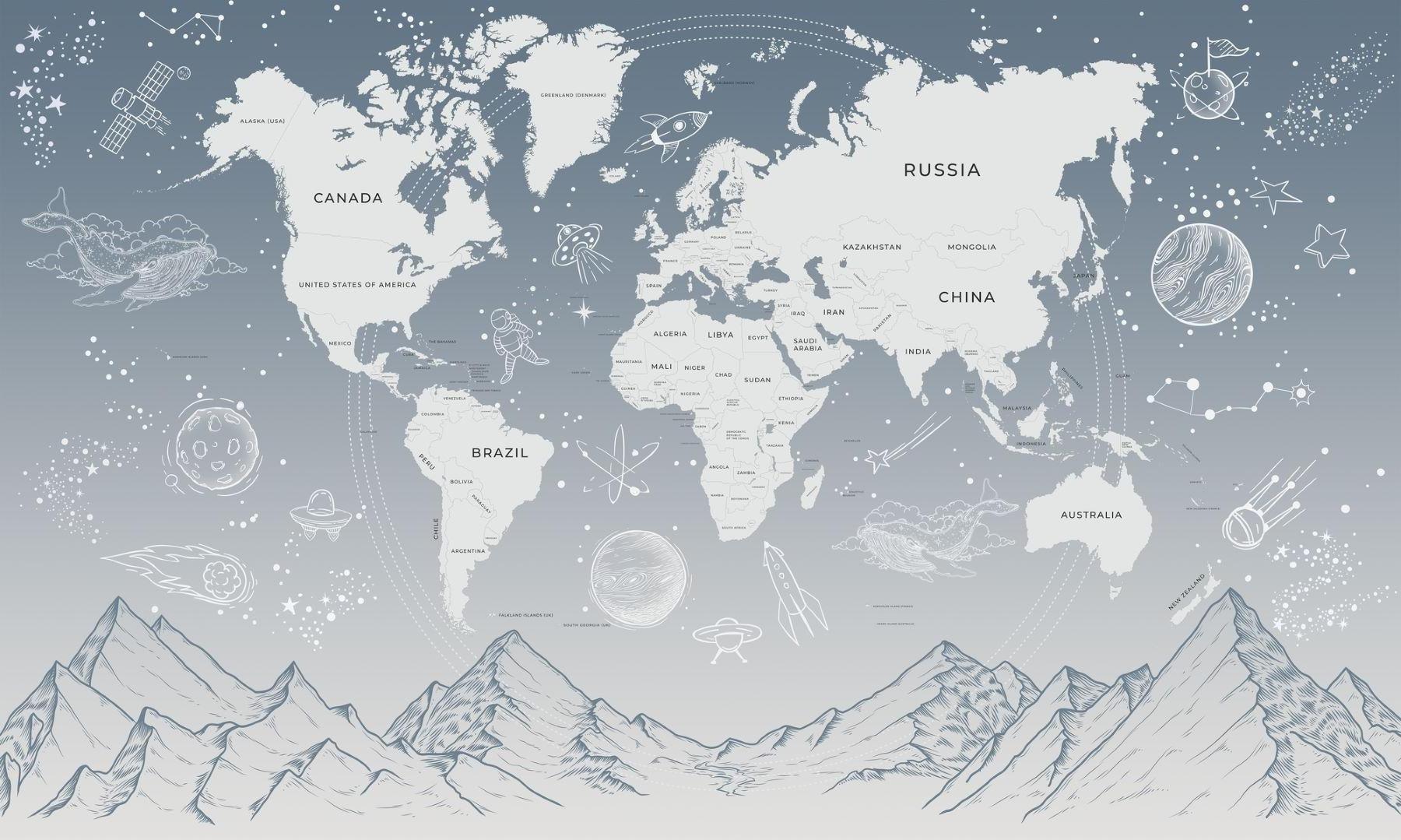 Ce papier peint carte du monde combine l'éducation géographique avec des éléments spatiaux enchanteurs dans une palette de couleurs sophistiquée bleu-gris et blanc. La carte du monde détaillée sert de pièce maîtresse, tandis que des dessins linéaires ludiques d'éléments à thème spatial flottent autour, incluant des fusées, des astronautes, des planètes et des constellations. Des silhouettes de montagnes le long de la base ajoutent de la profondeur, tandis que de délicats points et étoiles créent une atmosphère cosmique fascinante.