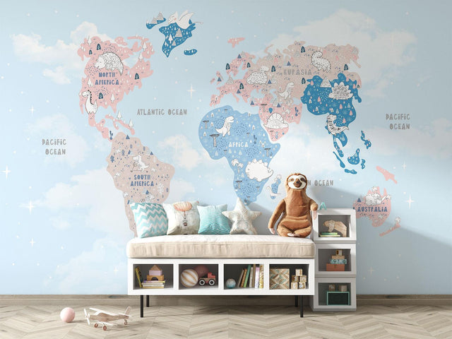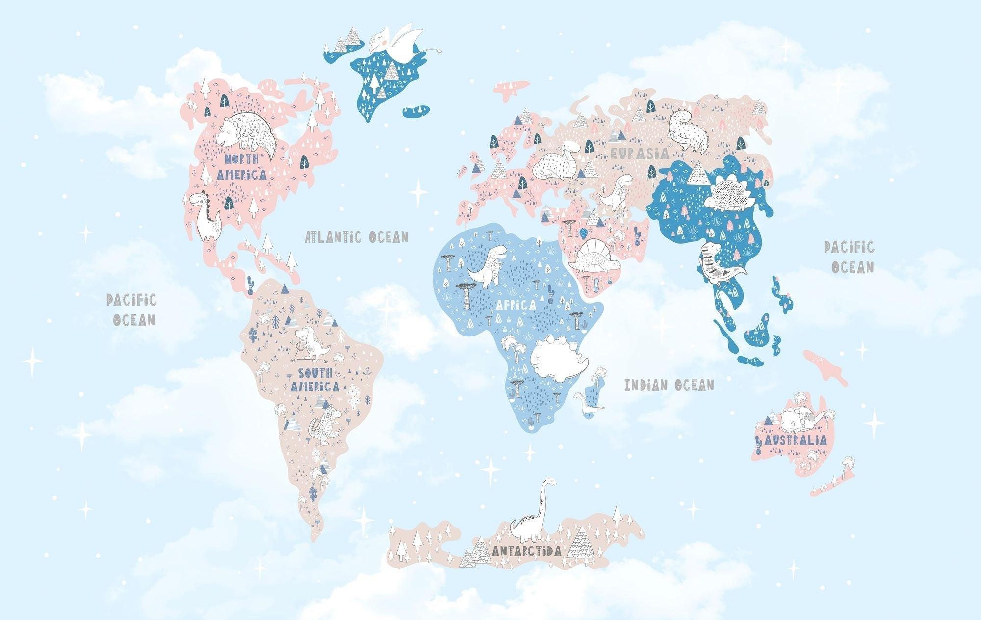 Papier Peint Mural Carte du Monde | Aventure de Dinosaures en Couleurs Pastel