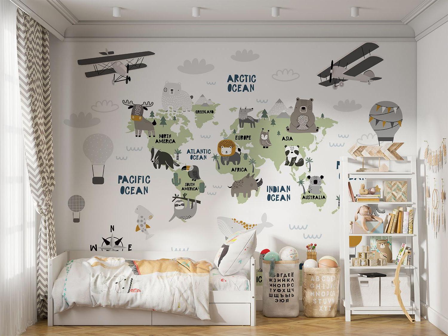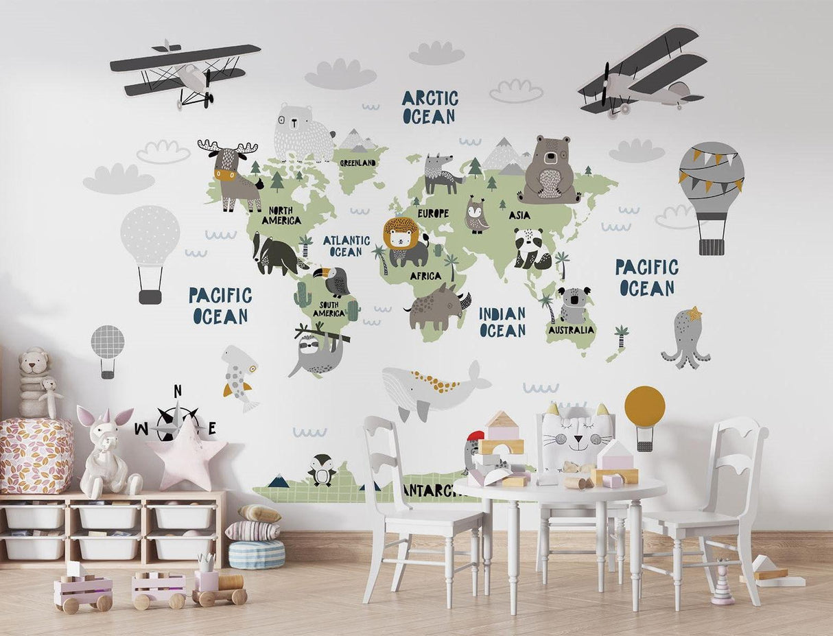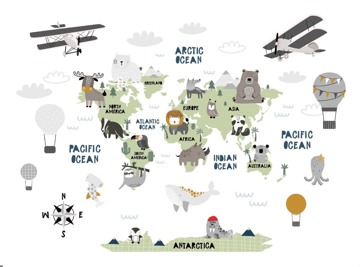 Papier Peint Mural Carte du Monde | Thème Aventure Enfants avec Animaux