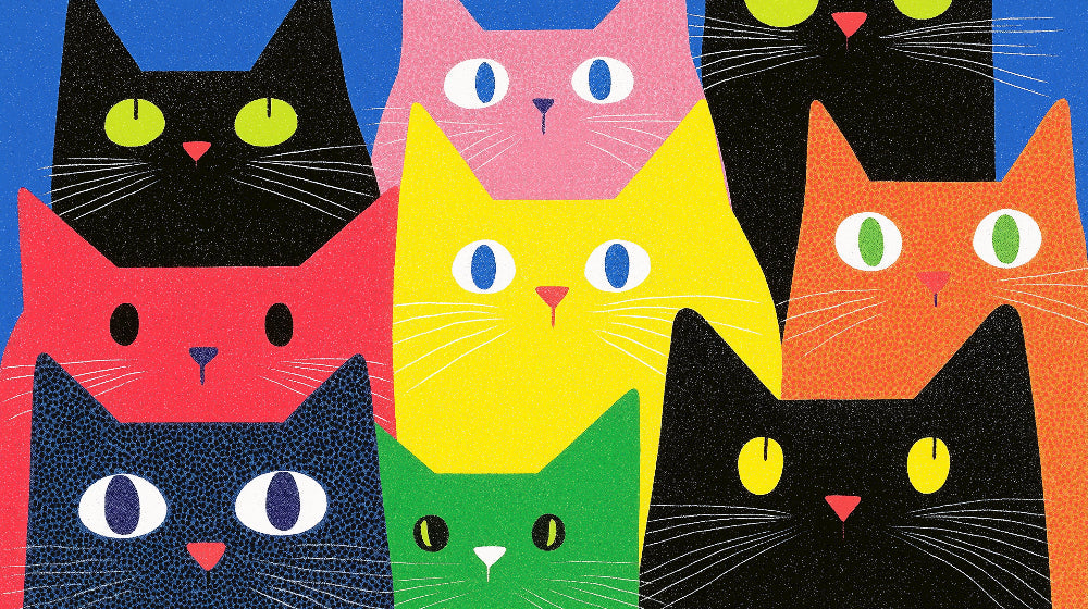 Ce papier peint chat moderne présente une collection vibrante de visages félins stylisés géométriquement, chacun exprimant un caractère unique à travers des couleurs audacieuses et contrastées. La composition artistique met en scène des chats rendus en jaune frappant, rose, orange, noir et bleu, avec des moustaches distinctives et des yeux expressifs créant un design ludique mais sophistiqué de papier peint géométrique pour animaux de compagnie. Les éléments texturaux et les lignes épurées apportent une touche contemporaine au thème classique des animaux de compagnie adorés.